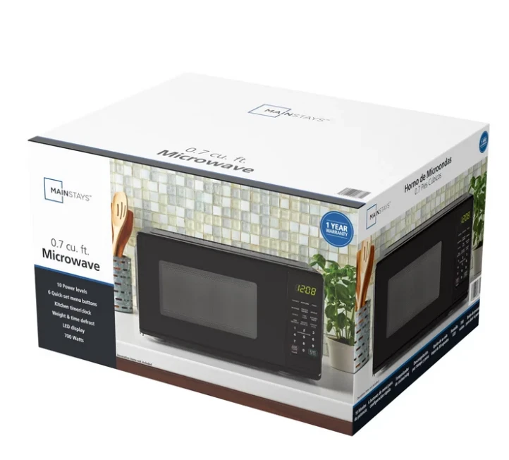 Product details Mainstays 0.7 Cu ft 700-Watt Compact Countertop Microwave Oven is available in 3 colors including Black, Red or White. Each color is designed to complement your kitchen, dorm room, office or rec room. Features include LED display, kitchen timer & clock, 10 different power levels for cooking a variety of foods, weight & time defrost, 6 convenient quick-set menu buttons, 30 second one-touch option, child safety lockout and a push-button door. The Mainstays 0.7 Cu ft 700-Watt Compact Countertop Microwave Oven is the perfect addition to any home. Condition: New, Stock Number: MS8436127995-01 Capacity 0.7 Cu ft LED display Kitchen timer & clock Weight & time defrost Child-safe lockout 700-Watt Power Push-button door opening 30 Second one-touch option Condition: New 10 Power levels 6 Quick-set menu buttons