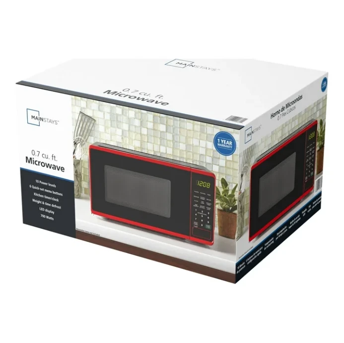 Product details Mainstays 0.7 Cu ft 700-Watt Compact Countertop Microwave Oven is available in 3 colors including Black, Red or White. Each color is designed to complement your kitchen, dorm room, office or rec room. Features include LED display, kitchen timer & clock, 10 different power levels for cooking a variety of foods, weight & time defrost, 6 convenient quick-set menu buttons, 30 second one-touch option, child safety lockout and a push-button door. The Mainstays 0.7 Cu ft 700-Watt Compact Countertop Microwave Oven is the perfect addition to any home. Condition: New, Stock Number: MS8436127995-02 Capacity 0.7 Cu ft LED display Kitchen timer & clock Weight & time defrost Child-safe lockout 700-Watt Power Push-button door opening 30 Second one-touch option Condition: New 10 Power levels 6 Quick-set menu buttons Stock Number: MS8436127995-02