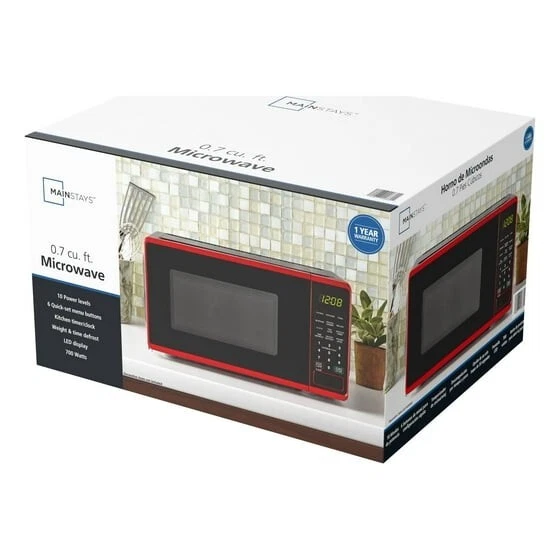 Product details Mainstays 0.7 Cu ft 700-Watt Compact Countertop Microwave Oven is available in 3 colors including Black, Red or White. Each color is designed to complement your kitchen, dorm room, office or rec room. Features include LED display, kitchen timer & clock, 10 different power levels for cooking a variety of foods, weight & time defrost, 6 convenient quick-set menu buttons, 30 second one-touch option, child safety lockout and a push-button door. The Mainstays 0.7 Cu ft 700-Watt Compact Countertop Microwave Oven is the perfect addition to any home. Condition: New, Stock Number: MS8436127995-02 Capacity 0.7 Cu ft LED display Kitchen timer & clock Weight & time defrost Child-safe lockout 700-Watt Power Push-button door opening 30 Second one-touch option Condition: New 10 Power levels 6 Quick-set menu buttons Stock Number: MS8436127995-02
