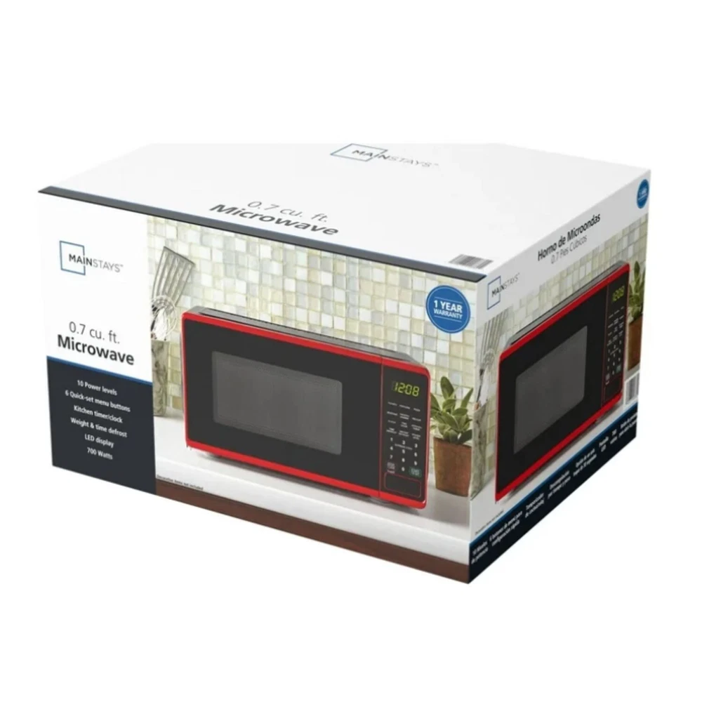 About this item Product details Mainstays 0.7 Cu ft 700-Watt Compact Countertop Microwave Oven is available in 3 colors including Black, Red or White. Each color is designed to complement your kitchen, dorm room, office or rec room. Features include LED display, kitchen timer & clock, 10 different power levels for cooking a variety of foods, weight & time defrost, 6 convenient quick-set menu buttons, 30 second one-touch option, child safety lockout and a push-button door. The Mainstays 0.7 Cu ft 700-Watt Compact Countertop Microwave Oven is the perfect addition to any home. Condition: New, Stock Number: MS8436127995-02 Capacity 0.7 Cu ft LED display Kitchen timer & clock Weight & time defrost Child-safe lockout 700-Watt Power Push-button door opening 30 Second one-touch option Condition: New 10 Power levels 6 Quick-set menu buttons Stock Number: MS8436127995-02 More details Brand unbranded Microwave Oven Type Countertop Microwave Ovens Manufacturer Part Number MS8436127995-02 Model MS8436127995-02 Door Opening Side Left Swing Features Digital Display, Timer Oven Feature One Touch Cooking, Programmed Cooking Modes, Safety Lock, Turntable Plate Volume Capacity 0.7 cu ft Amps 15 Amps Volts 120 V Watts 700 W Microwave Turntable Diameter 9.65 in Microwave Oven Vent Location Back Color Red Front Panel Finish Red Assembled Product Weight 20.06 lb Assembled Product Dimensions (L x W x H) 17.56 x 12.72 x 9.57 Inches