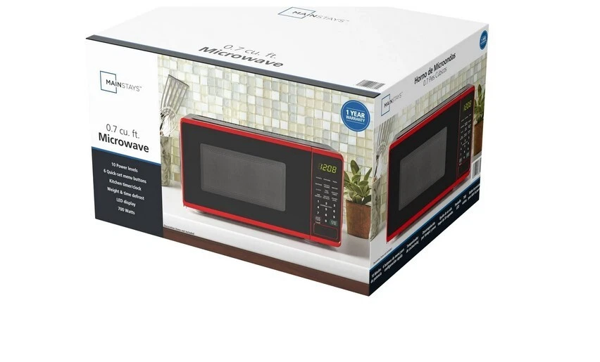 About this item Product details Mainstays 0.7 Cu ft 700-Watt Compact Countertop Microwave Oven is available in 3 colors including Black, Red or White. Each color is designed to complement your kitchen, dorm room, office or rec room. Features include LED display, kitchen timer & clock, 10 different power levels for cooking a variety of foods, weight & time defrost, 6 convenient quick-set menu buttons, 30 second one-touch option, child safety lockout and a push-button door. The Mainstays 0.7 Cu ft 700-Watt Compact Countertop Microwave Oven is the perfect addition to any home. Condition: New, Stock Number: MS8436127995-02 Capacity 0.7 Cu ft LED display Kitchen timer & clock Weight & time defrost Child-safe lockout 700-Watt Power Push-button door opening 30 Second one-touch option Condition: New 10 Power levels 6 Quick-set menu buttons Stock Number: MS8436127995-02 Specifications Brand Mainstays Microwave Oven Type Countertop Microwave Ovens Manufacturer Part Number MS8436127995-02 Model MS8436127995-02