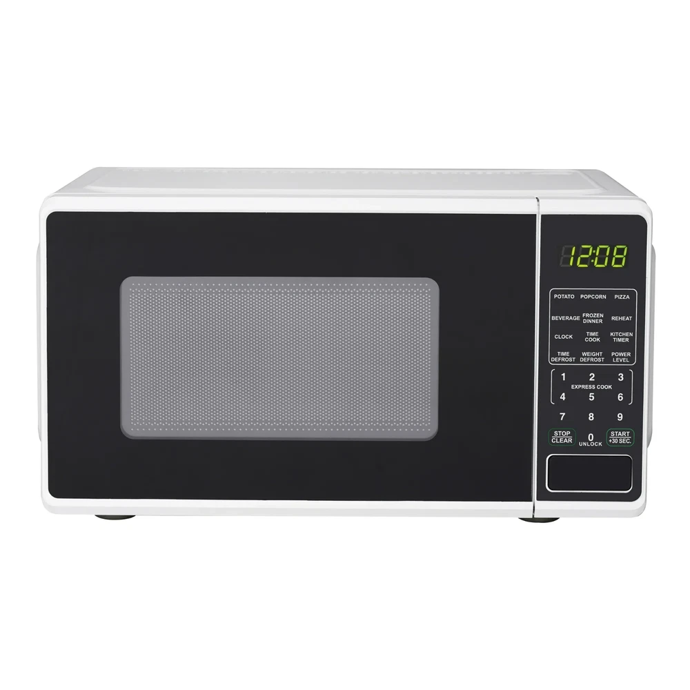 Mainstays 0.7 Cu ft Countertop Microwave Oven, 700 Watts, White Mainstays 0.7 Cu ft 700-Watt Compact Countertop Microwave Oven is available in 3 colors including Black, Red or White. Each color is designed to complement your kitchen, dorm room, office or rec room. Features include LED display, kitchen timer & clock, 10 different power levels for cooking a variety of foods, weight & time defrost, 6 convenient quick-set menu buttons, 30 second one-touch option, child safety lockout and a push-button door. The Mainstays 0.7 Cu ft 700-Watt Compact Countertop Microwave Oven is the perfect addition to any home. Condition: New; Stock Number: MS8436127995-03 Mainstays 0.7 Cu ft Countertop Microwave Oven, White Capacity 0.7 Cu ft 700-Watt Power LED display Kitchen timer & clock 10 Power levels Weight & time defrost 6 Quick-set menu buttons 30 Second one-touch option Child-safe lockout Push-button door opening Condition: New Stock number MS8436127995-03 info: