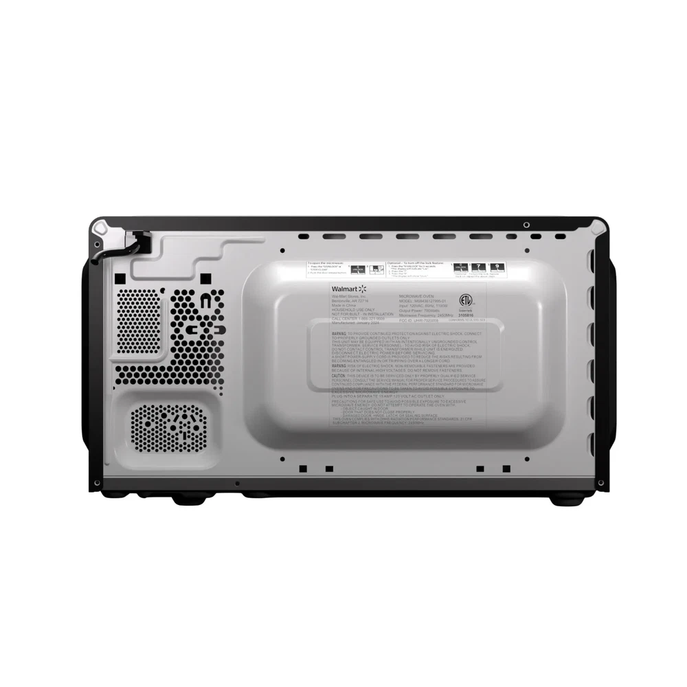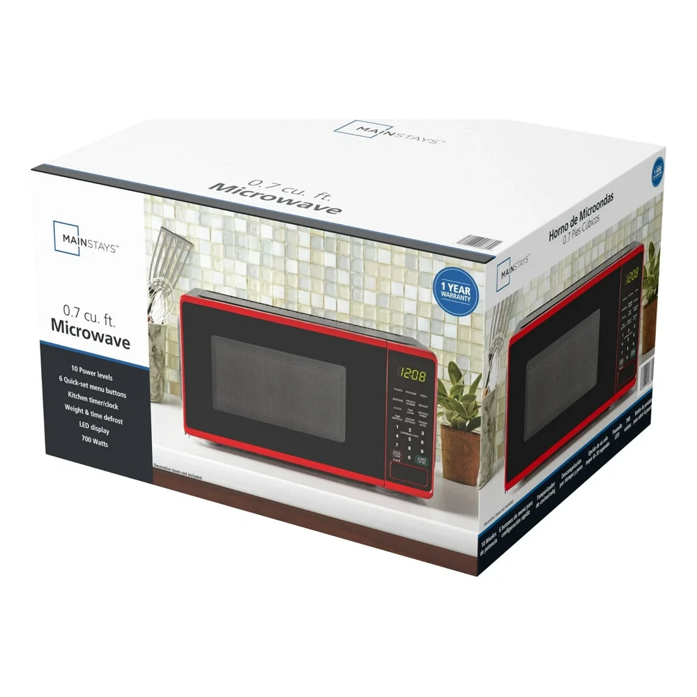 Mainstays 0.7 Cu ft Countertop Microwave Oven, 700 Watts Mainstays 0.7 Cu ft 700-Watt Compact Countertop Microwave Oven is available in 3 colors including Black, Red or White. Each color is designed to complement your kitchen, dorm room, office or rec room. Features include LED display, kitchen timer & clock, 10 different power levels for cooking a variety of foods, weight & time defrost, 6 convenient quick-set menu buttons, 30 second one-touch option, child safety lockout and a push-button door. The Mainstays 0.7 Cu ft 700-Watt Compact Countertop Microwave Oven is the perfect addition to any home. Condition: New, Stock Number: MS8436127995-01 Capacity 0.7 Cu ft LED display Kitchen timer & clock Weight & time defrost Child-safe lockout 700-Watt Power Push-button door opening 30 Second one-touch option Condition: New 10 Power levels 6 Quick-set menu buttons Stock Number: MS8436127995-01 Microwave Oven Type Countertop Microwave Ovens Manufacturer Part Number MS8436127995-01 Model MS8436127995-01 Door Opening Side Left Swing Features Timer Oven Feature Turntable Plate Volume Capacity 0.7 cu ft Amps 15 Amps Volts 120 V Watts 700 W Microwave Turntable Diameter 9.65 in Microwave Oven Vent Location Back Oven Cleaning Method Manual-Clean SKU : 5125973778