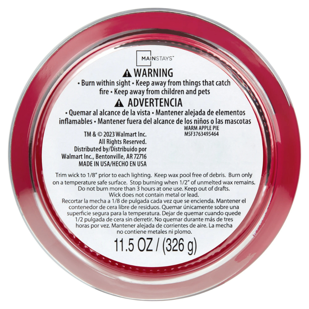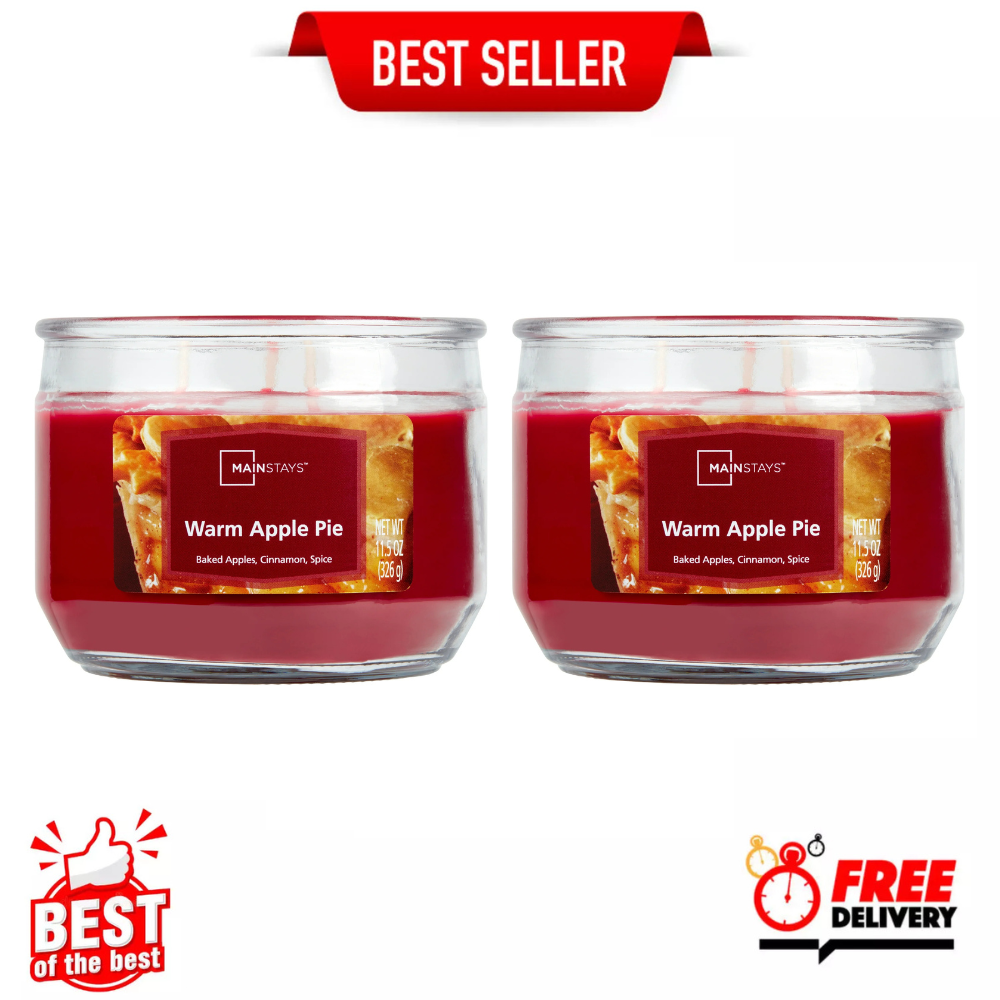 Mainstays 11.5 Ounce Warm Apple Pie 3-Wick Glass Jar Candle ( Pack of 2 ) Introduce a soothing aroma into your living space with Mainstays candles. Mainstays scented candles are highly fragranced, and provide a clean and even burn that will fill your home with beautiful and enticing seasonal aromas. Place this candle in the kitchen, living room or dining room where you can enjoy it when entertaining guests or anytime you want to relax. Trim the wick periodically to promote even burning. Mainstays offers a wide selection of candle scents to explore and enjoy. Shop all of our Mainstays scents online and in-store. Mainstays Warm Apple Pie Scented 3-Wick Glass Jar Candle, 11.5oz The joy of baking is captured in this all-time favorite treat. Mainstays Warm Apple Pie fragrance, contains orchard apples, red pear and orange zest, embraced at the heart with cranberry, nutmeg, clove and allspice. Cinnamon stick, graham cracker crust and vanilla add a touch of decadence at the bottom. This is in the GOURMAND category. Premium-grade paraffin wax blended with premium quality ingredients to create distinctive true-to-life scents Clear glass container complements virtually any room décor and provides just the right amount of illumination with a 3-wick design Pleasant scent for a relaxing environment without becoming overpowering. Helps improve concentration, mood, and positive thinking Product measures 4.12" D x 3.2" H Product weighs 1.37 lbs