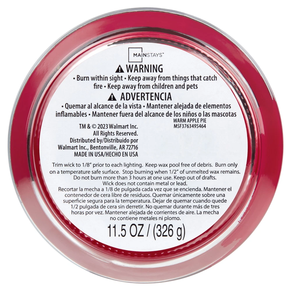 Introduce a soothing aroma into your living space with Mainstays candles. Mainstays scented candles are highly fragranced, and provide a clean and even burn that will fill your home with beautiful and enticing seasonal aromas. Place this candle in the kitchen, living room or dining room where you can enjoy it when entertaining guests or anytime you want to relax. Trim the wick periodically to promote even burning. Mainstays offers a wide selection of candle scents to explore and enjoy. Shop all of our Mainstays scents online and in-store. Mainstays Warm Apple Pie Scented 3-Wick Glass Jar Candle, 11.5oz The joy of baking is captured in this all-time favorite treat. Mainstays Warm Apple Pie fragrance, contains orchard apples, red pear and orange zest, embraced at the heart with cranberry, nutmeg, clove and allspice. Cinnamon stick, graham cracker crust and vanilla add a touch of decadence at the bottom. This is in the GOURMAND category. Premium-grade paraffin wax blended with premium quality ingredients to create distinctive true-to-life scents Clear glass container complements virtually any room décor and provides just the right amount of illumination with a 3-wick design Pleasant scent for a relaxing environment without becoming overpowering. Helps improve concentration, mood, and positive thinking Product measures 4.12" D x 3.2" H Product weighs 1.37 lbs