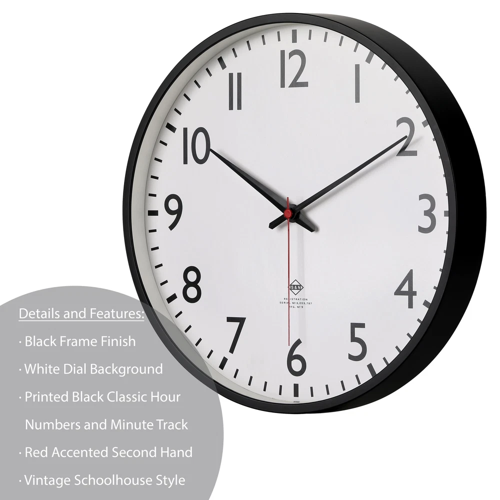 The 11.5" diameter classic schoolhouse style wall clock is more than just a timepiece. It’s an accent piece that never goes out of style. The classic black frame, accentuated by the white dial, creates a striking contrast that draws the eye. The iconic red second hand adds detail and classic interest to the design. Accurate timekeeping is powered by a quality quartz movement. The nostalgic vintage vibe of this clock, combined with its solid design and classic numbers font, makes it an exquisite piece that's perfect for any space. Whether it's your kitchen, living room, office, or even a classroom, this clock brings a touch of sophisticated charm to the atmosphere. Mainstays 11.5” Quartz Black & White Schoolhouse Wall Clock with Red Second Hand Classic Schoolhouse Style Wall Clock 11.5" diameter x 1.5" Requires 1 "AA" Battery to Operate (Battery not Included) Glass Lens Red Metal Second Hand