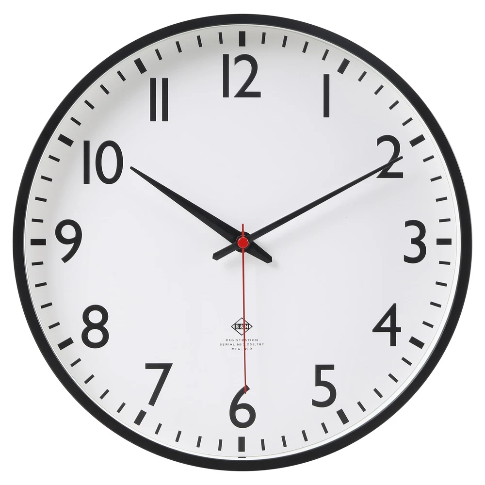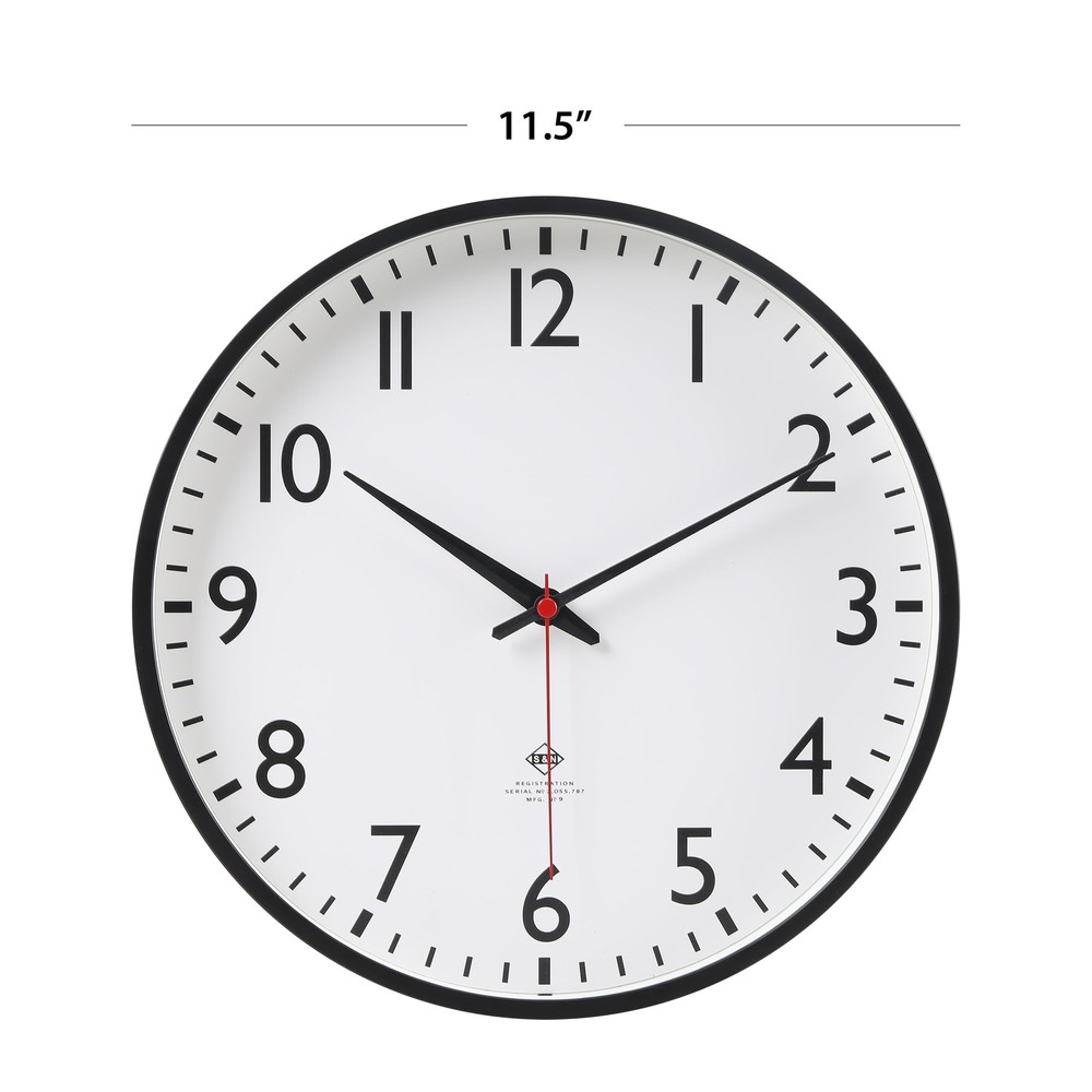The 11.5" diameter classic schoolhouse style wall clock is more than just a timepiece. It’s an accent piece that never goes out of style. The classic black frame, accentuated by the white dial, creates a striking contrast that draws the eye. The iconic red second hand adds detail and classic interest to the design. Accurate timekeeping is powered by a quality quartz movement. The nostalgic vintage vibe of this clock, combined with its solid design and classic numbers font, makes it an exquisite piece that's perfect for any space. Whether it's your kitchen, living room, office, or even a classroom, this clock brings a touch of sophisticated charm to the atmosphere. Mainstays 11.5” Quartz Black & White Schoolhouse Wall Clock with Red Second Hand Classic Schoolhouse Style Wall Clock 11.5" diameter x 1.5" Requires 1 "AA" Battery to Operate (Battery not Included) Glass Lens Red Metal Second Hand