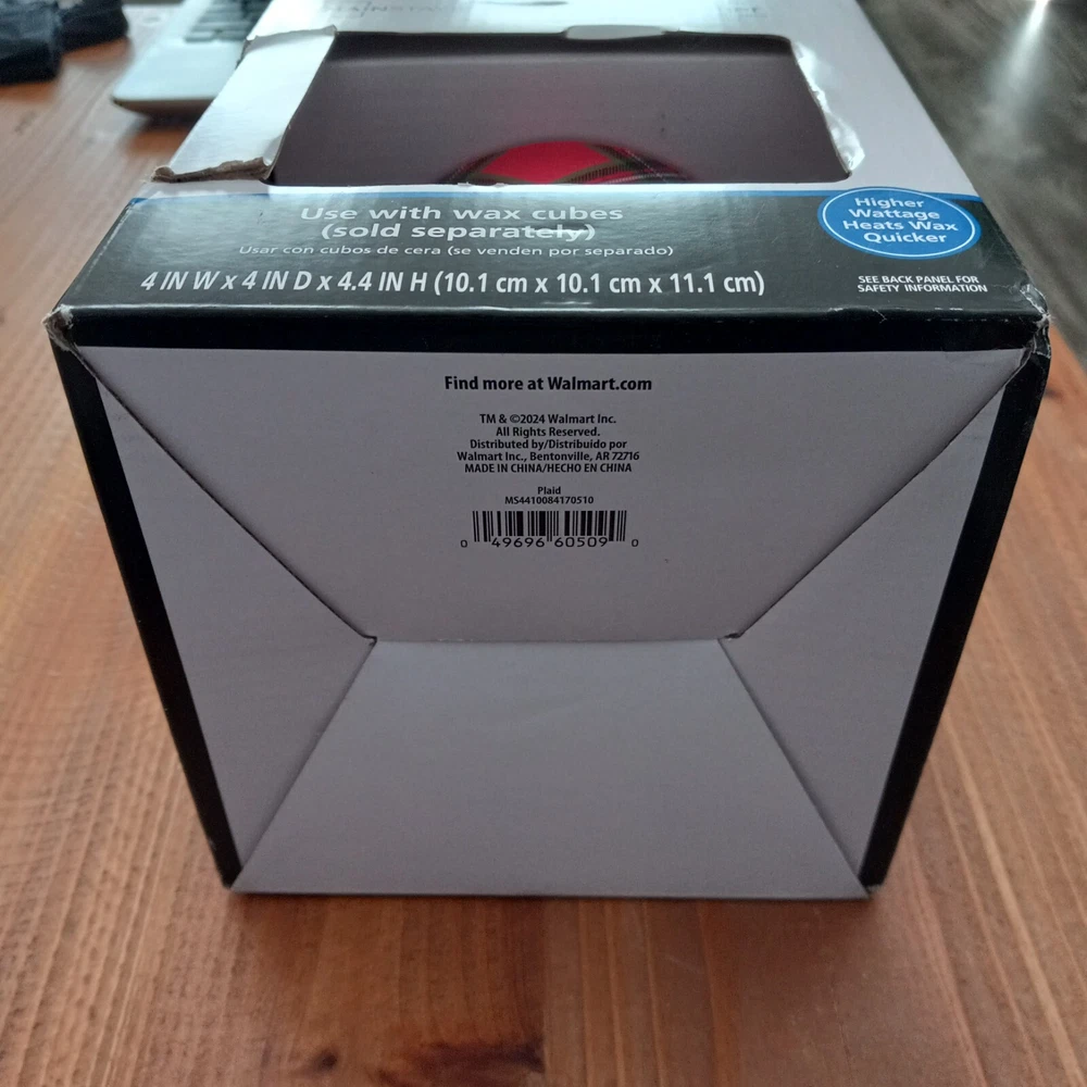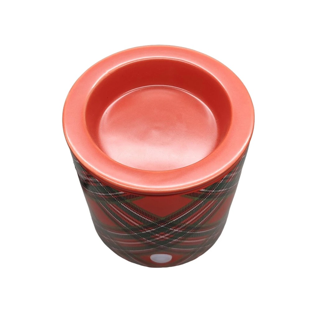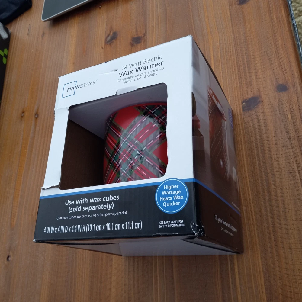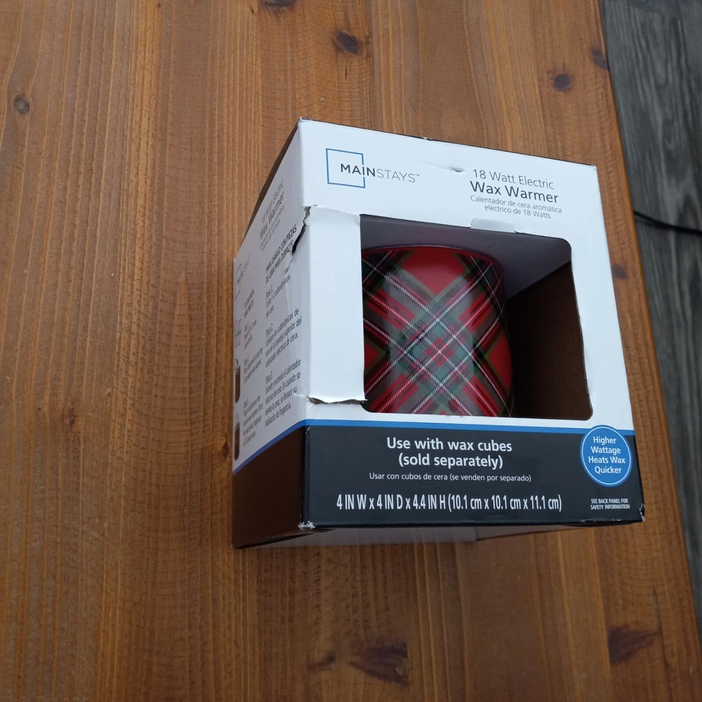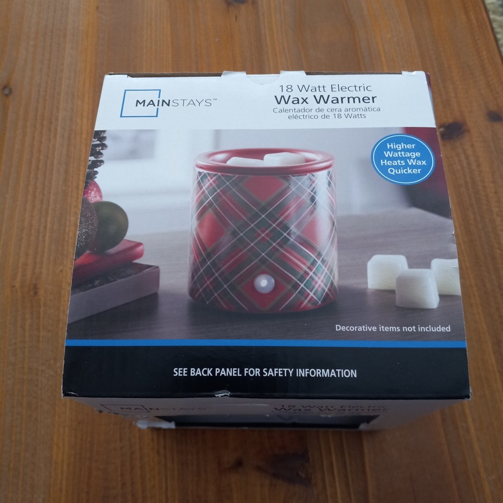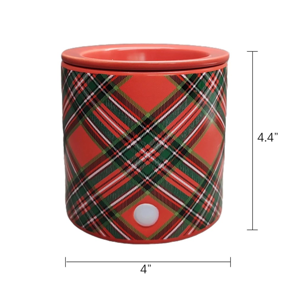 Transform your living space with the Mainstays Electric Plaid Decal Ceramic Wax Warmer,Multicolor. Featuring a versatile pillar-shaped design with a plaid decal exterior, this warmer effortlessly adds Christmas vibes to your decor. Simply drop your desired amount of wax melts in the warmer and sit back as it fills the room with the soothing aroma of your favorite scent. Since electric warmer is flameless, it melts the wax gently and efficiently. The scents are aromatic and slowly released, creating a comfortable living and working environment to safely enjoy without a flame or dirty soot. The wax warmer's cord is 36 inches long with a switch for easy on and off functionality without having to unplug the device. A built-in LED indicator light shows you when the warmer is hot and in use — simple, stylish, and chic. Mainstays Electric Ceramic Wax Warmer’s heating plate acts as a safe heat source making gradual, reliable and stable temperature; without flame, soot or other pollutants. Heating plate design eliminates the need to purchase replacement bulbs, just plug in and enjoy. Stable temperature and uniform heating allows warmer to gently release scent allowing for wax and oils to omit fragrance longer Easy and safe to use — simply add wax melts to the warmer, turn it on, and enjoy your favorite fragrance. For simple cleanup, allow the wax to harden and completely cool before removing from the warmer. Wipe with a damp, soft cloth to clean wax residue. Measures 4" W x 4" D x 4.4" H. Red body with plaid decal. Electric wax warmer comes with a 36 inch power cord. Built with an LED on/off indicator light. Wax melts sold separately. Slight damage to box. See pictures. Warmer appears to be fine. Decorative accessories and wax melts not included. Warmer only.