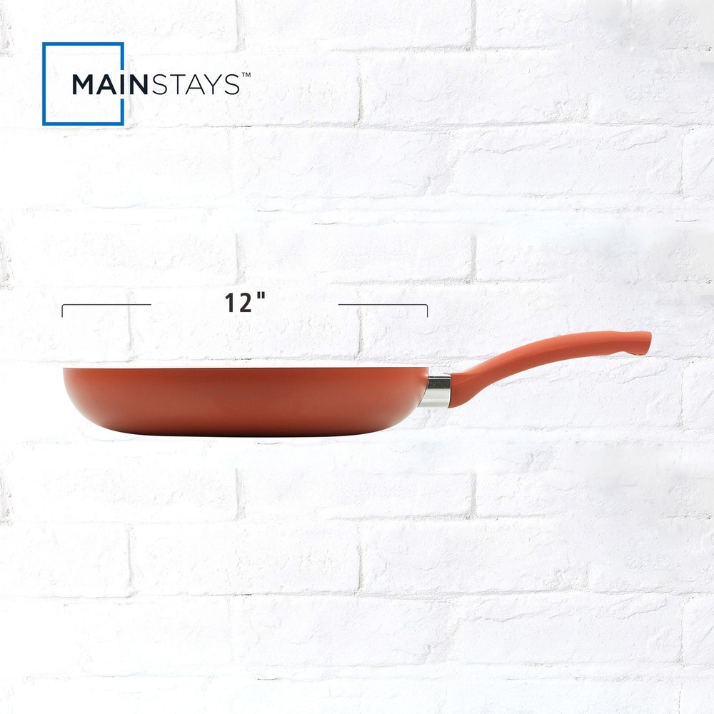 Update your kitchen essentials with the Mainstays Ceramic Aluminum Nonstick 12in Frypan Red Canyon. This 12in aluminum frypan is ideal for everyday cooking at home. Easy clean up. Aluminum body distributes heat more fast and even, it will help you save time cooking as well. The interior is coated with 2 layers of PPG Customized ceramic coating, which is healthy and makes cooking and clean-up easy. Handle is strongly connected by rivets. It is suitable for all cooktops except induction. The outside red color of this frypan will offer a bright of color to your kitchen Mainstays 19.48 x 12.00 x 2.16 in Nonstick Aluminum Frying Pan Aluminum body for fast and even heating Riveted handle for a strong connection Suitable for all cooktops except induction Coated with 2 layers of PPG Customized ceramic coating for easy cooking and cleanup Bright red exterior adds a of color to your kitchen