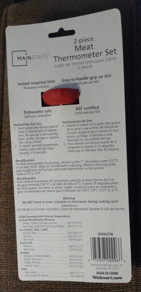Mainstays 2 piece Meat thermometer Red 00996STW This KitchenAid Stainless Steel instant read analog dial thermometer is a great addition to any kitchen tool repertoire. The sturdiness of the shatterproof plastic lens along with the thermometer's ability to withstand drops to the floor makes it a long term solution to any cooking or baking needs. This product also has a protective pocket sleeve with a recalibration wrench and can be use as an extended handle for the 0.08 lb thermometer. NSF listed. Helpful hints: This thermometers is not meant to be left in food during cooking. The plastic lens could be damaged with excessive heat. Important: Thermometer will be hot after use. Use potholders or oven mitts when handling hot thermometer. CONSTRUCTION: This instant read meat temperature thermometer features a 1-inch dial that is magnified by convex plastic lens to enhance viewing UNIQUE FEATURE: The storage sleeve features a custom calibration wrench and provides protective storage when not in use TEMPERATURE RANGE: 20 to 220 degrees Fahrenheit LIGHT WEIGHT DESIGN: 0.08 lb with a Stainless Steel probe. CLEANING: Dishwasher safe Instant response Includes pocket sheeth with carious meat temperatures recommended Soft touch grip View our eBay store for great deals and additional 'passed on' savings from auction listing fees Buyer pays all shipping and handling charges Following Countries will not be shipped to at this time: Brazil, Italy, UAE Please Read Before Bidding By bidding on this auction you agree to the following terms General Information The winning bidder will be sent an invoice by e-mail and must contact our office for payment within 24 hrs . Our business hours are Mon. thru Fri. 9:30AM to 5:00PM CST. We are closed Sat.,Sun. and holidays. All emails will be answered, all payments will be processed, and all packages will be shipped only during our business hours on Tuesdays and Thursdays. If your payment arrives Tuesday after 1PM item will not ship until Thursday, etc. Any emails you send us should include an eBay item #, your user ID and email address registered with eBay. We make every effort to ensure that everything you receive is just as it should be, but sometimes an item can have a defect that is not noticed until it is delivered to the customer. If this happens, please e-mail us for further instructions within 3 days of receipt of the package. Orders can not be cancelled, refused or returned because of manufacturers defect. The defect will will be corrected or replacement items will be sent. All buyer feedback will be entered after item receipt confirmation has been received via email and seller feedback has been entered into eBay system from buyer. If you have an issue with an item it is expected that you communicate in a professional manner with seller so that issue can be resolved quickly. We present sharp pictures of products we put out for auction so you can better see what you are bidding for. A copyright notice exists on all pictures and within html pages. Shipping The shipping for this item is set to a flat rate*. All items are verified before they are shipped. Returns are accepted only if the item is defective out of the box (DOA). Buyer must notify seller and return ship the item within 3 days; buyer is responsible for return shipping charges. Payment is payable upon completion of auction using Paypal. All packages will be shipped with insurance coverage and receipt confirmation number. In the unlikely event that your package is lost while in transit to you, the package and its contents will be replaced by the carrier. Sorry, but no refunds will be issued on lost packages. All shipments are F.O.B. Shipping Point and become the property of the receiver upon being turned over to the carrier. If you receive merchandise that was damaged in transit, you should contact postal carrier directly. Leave the item in its original containers and all packing materials. Carrier will inspect the item and will reimburse for the damages. Customer accepts that all damages are the responsibility of the carrier and that all items shipping by API_Services were sent in good condition. All damages must be reported to carrier of the package within 3 days of receipt of your package. International shipments are not insured unless buyer specifically requests it and it will be at buyers expense. Lost items insured or not will not be refunded by seller. All claims for shortages to your item must be made within 3 days of receipt of your package. We reserve the right to correct any mistake or replace any missing item. We Ship INSIDE THE CONTINENTAL USA and CANADA.. * Canadian residents add $6 to shipping charges. (We will ship to Hawaii or Alaska - inquire via email to determine additional rate ). Other Country's will be considered. You MUST email for shipping/handling charges before bidding. Physical addresses ONLY (Please no P.O. boxes, military bases, etc.). Payments Pay by Paypal with a credit card, Visa, MasterCard, Discover and American Express . We will ship to confirmed billing address only. No COD, Escrow, or 3rd party payments accepted. We stand by what we sell. Some items may be white boxed, out of box condition. All items are verified before they are auctioned. Thank You for Bidding and Good Luck!