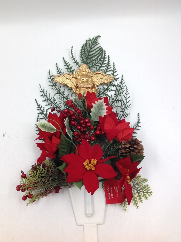 Mainstays 21" All Red Poinsettia Angel Christmas Cemetery Grave Stake Lot 2 Mainstays 21" Artificial Floral Stake with Angel Décor, Poinsettia Red Color. During this holiday season, it is a lovely way to memorialize a loved one using this Mainstays Artificial Cemetery Floral arrangement. This Artificial floral features beautiful Poinsettia with a golden Angel Decor. Just stake it into the ground for a simple and heartwarming display. It is designed with a pointed end that good fit to insert into grassland or soil. Mainstays Artificial Floral Poinsettia Flower Red Color 21" Height Body Material: Polyester Suitable for Cemetery or Memorial Purpose WE GIVE SO OTHERS CAN HAVE High Quality We understand that you have many options, and places to purchase your items. But when you purchase from Reflections of Trinity, you get so much more than a great, quality product ~ you significantly impact the lives of those most in need. Reflections of Trinity is a 501(c)3 non profit dedicated to serving those in crisis with food, clothing and basic needs. Our food pantry opens every Saturday and over 70% of those we serve are over 65 or under 18 years old. We are very community oriented and have facilitated several monthly opportunities for people to engage in meaningful service projects since 2003. Please call us or email if we did not meet your expectations and we will make things right. Note that we do not have control over the delivery time with USPS or UPS. All packages will have delivery confirmation. If you have any questions about this item, please ask before bidding.