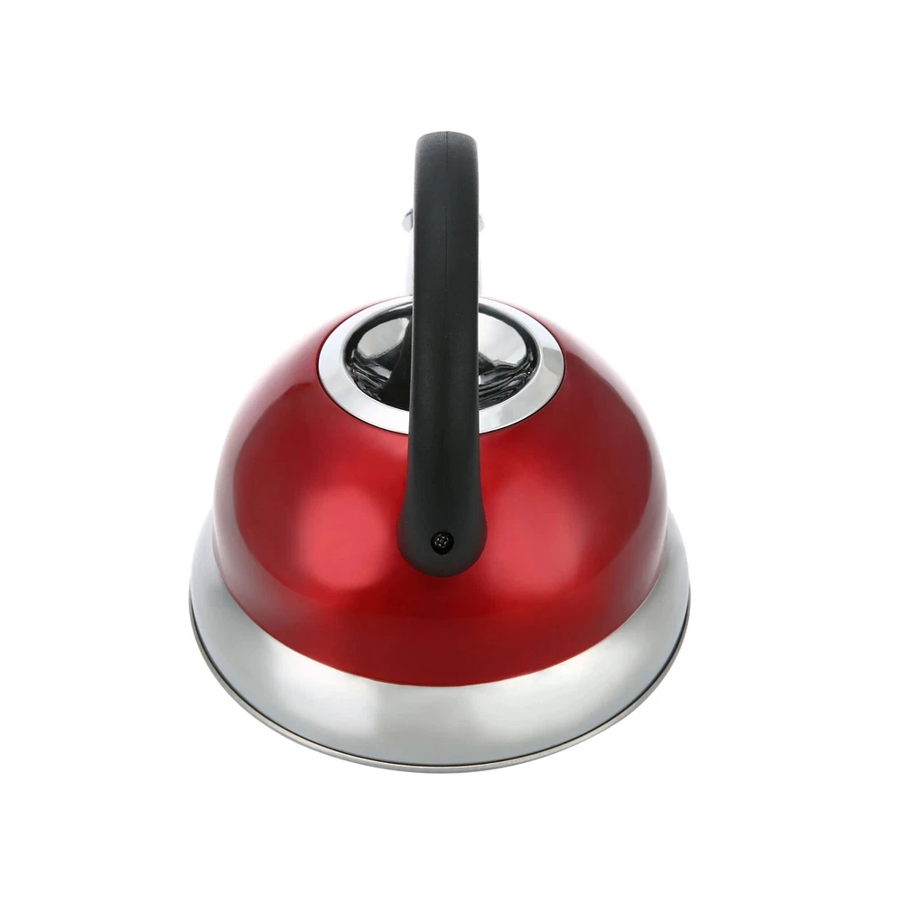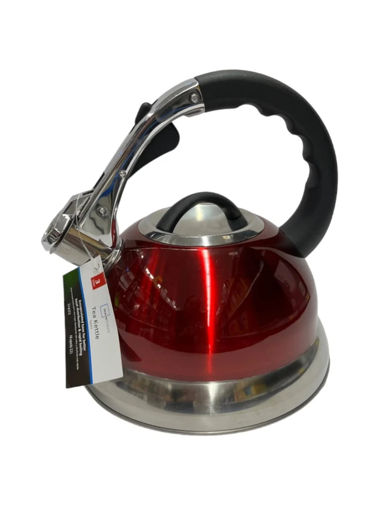Mainstays 3 Liter Whistling Tea Kettle, Stainless Steel, Red About this item Product details Warm up water for tea, cocoa and more inside the Mainstays Red Tea Kettle. It heats on the stove top and has a removable lid with a handle to cover the fill opening. Pouring is easier with a coated and contoured handle to offer a comfortable grip. When this 3L tea kettle whistles, simply push down the lever to open the spout. There are also max and mini fill lines for guidance. The polished design will bring elegance to your kitchen and a durable build. This kettle features an encapsulated base for better heat distribution and rapid boiling. CLASSY - This polished, red stainless steel finish will give your stove top a high end look. ADVANCED LEVER MECHANISM - Lever Mechanism opens spout for easy pouring. REMOVABLE LID - Removable lid has a handle for a hassle free filling. CONTOURED POURING HANDLE - Pour comfortably with the contoured pouring handle. FILL LINES - Enjoy the perfect cup of tea with the "Max" and "Min" Fill lines. HAND WASH ONLY *Please Note: water MUST reach at least the Minimum (MIN) fill line when boiling to prevent damage. "Dry Boiling" can result in potential hazards as well as damage to the product. The whistle feature also serves as a reminder to remove the kettle from the stovetop once boiling occurs. Mainstays Features Induction Compatible Brand Mainstays Color Red Material Stainless Steel Cleaning, Care & Maintenance Handwash Only Assembled Product Dimensions (L x W x H) 9.25 x 9.25 x 9.64 Inches