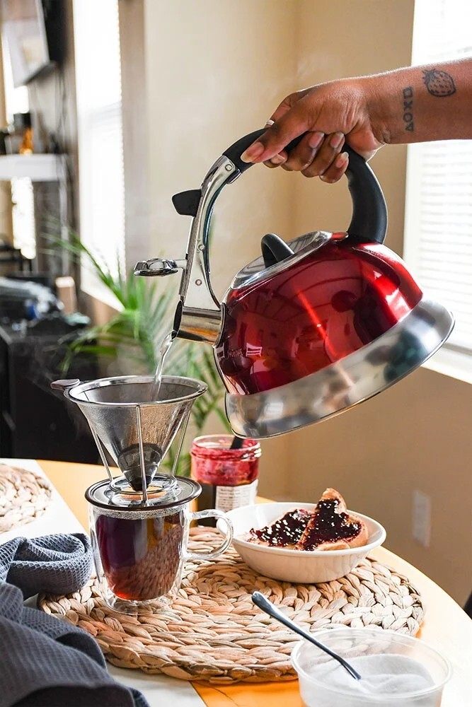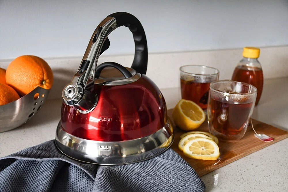 This tea kettle is a game-changer! Heats up water quickly, the whistle is loud and clear, and the bright red design adds a pop of color to my kitchen. The handle stays cool, and the spout pours smoothly without drips. Perfect for tea, coffee, or any hot drinks—love the max fill line too! Sturdy, stylish, and super functional. Highly recommend!