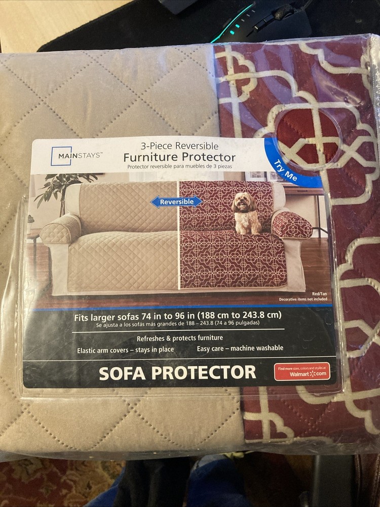 This Mainstays 3 piece Reversible Furniture Protector is perfect for your larger sofa, measuring 74 inches to 96 inches. The stylish red and tan colors will complement any living room decor, and the polyester material is durable and easy to clean. The slipcover is reversible, giving you two different looks in one! The protector is designed to fit the Model Red/Tan - MS98-336-586-06 and is an original product from the brand Mainstays. It is suitable for use in the living room and is not personalized. Get ready to protect your furniture and refresh your space with this versatile and stylish slipcover.