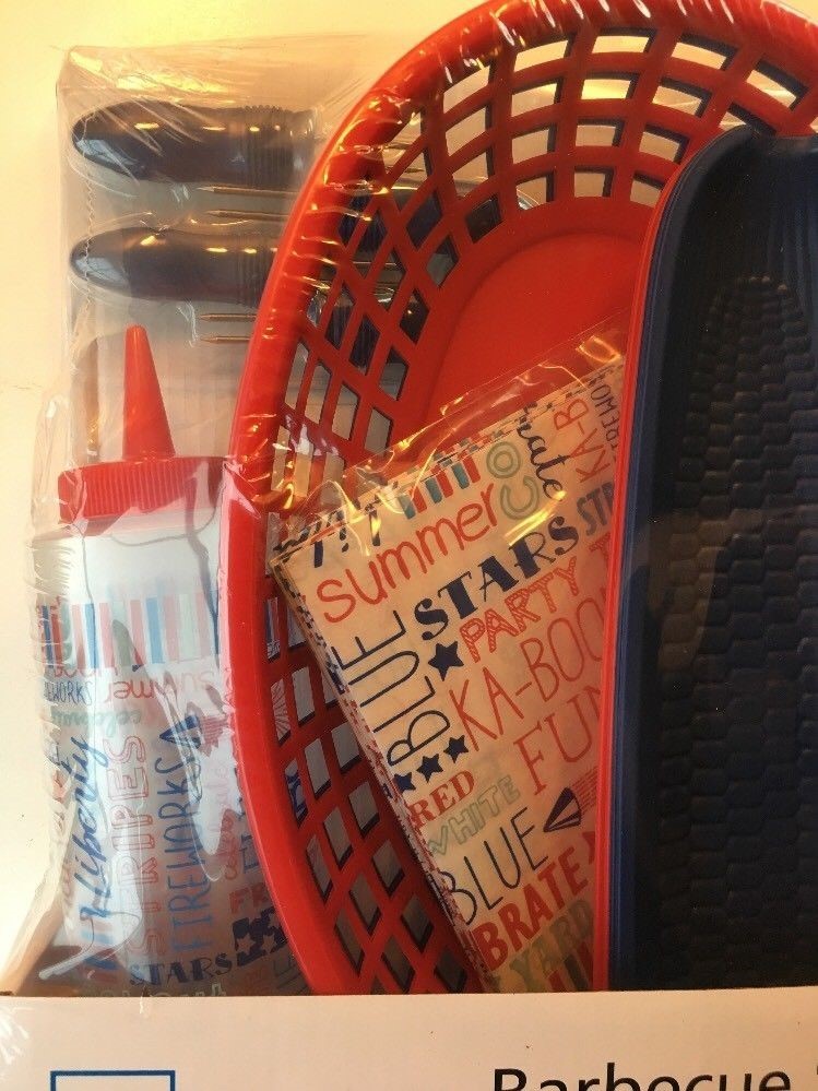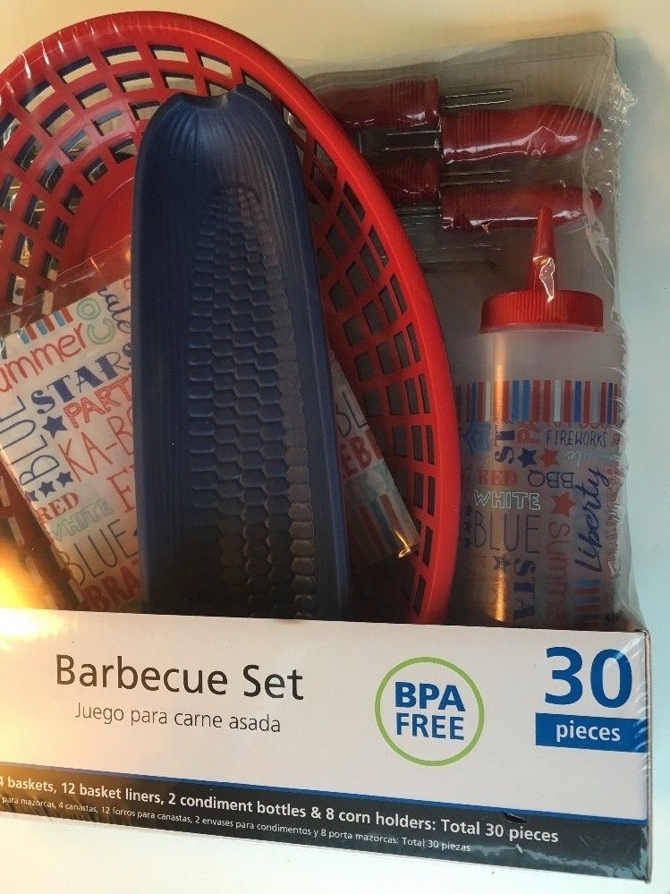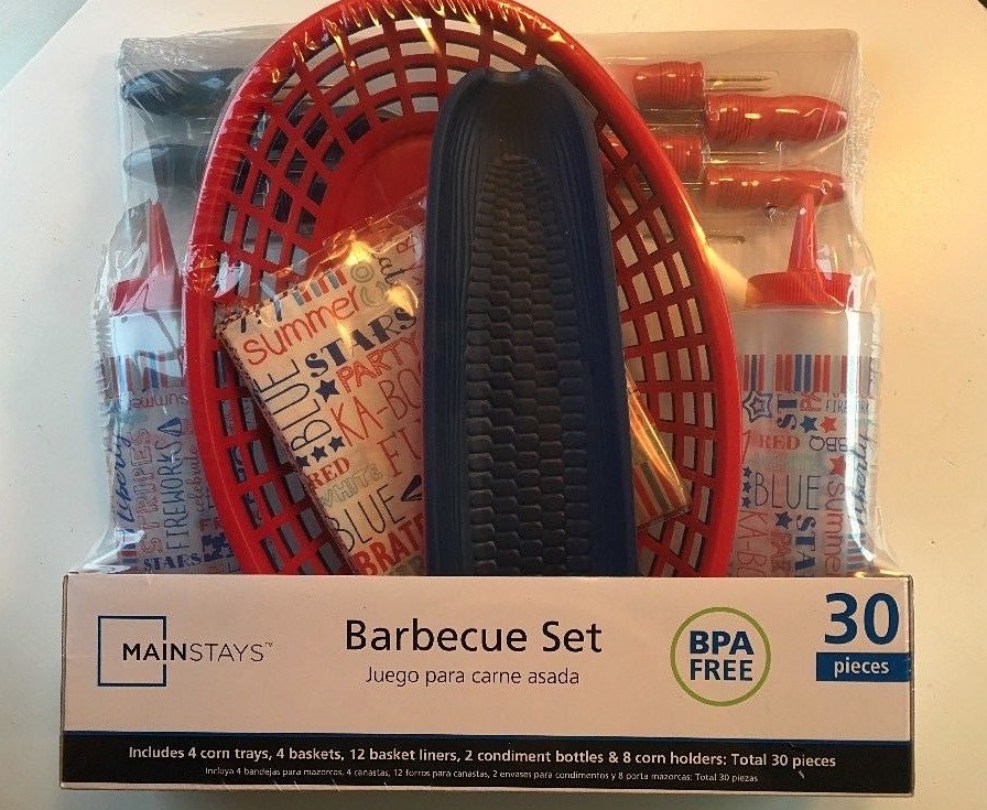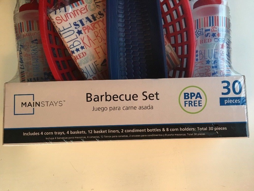 Mainstays 30 piece bbq set, brand new in package! Cheerful floral pattern with blue and Red pieces also. Perfect for use at a bbq, picnic, or poolside! BPA free Comes with: 4 baskets 4 corn trays 12 floral basket liners 2 condiment squeeze bottles with floral pattern 8 corn holders