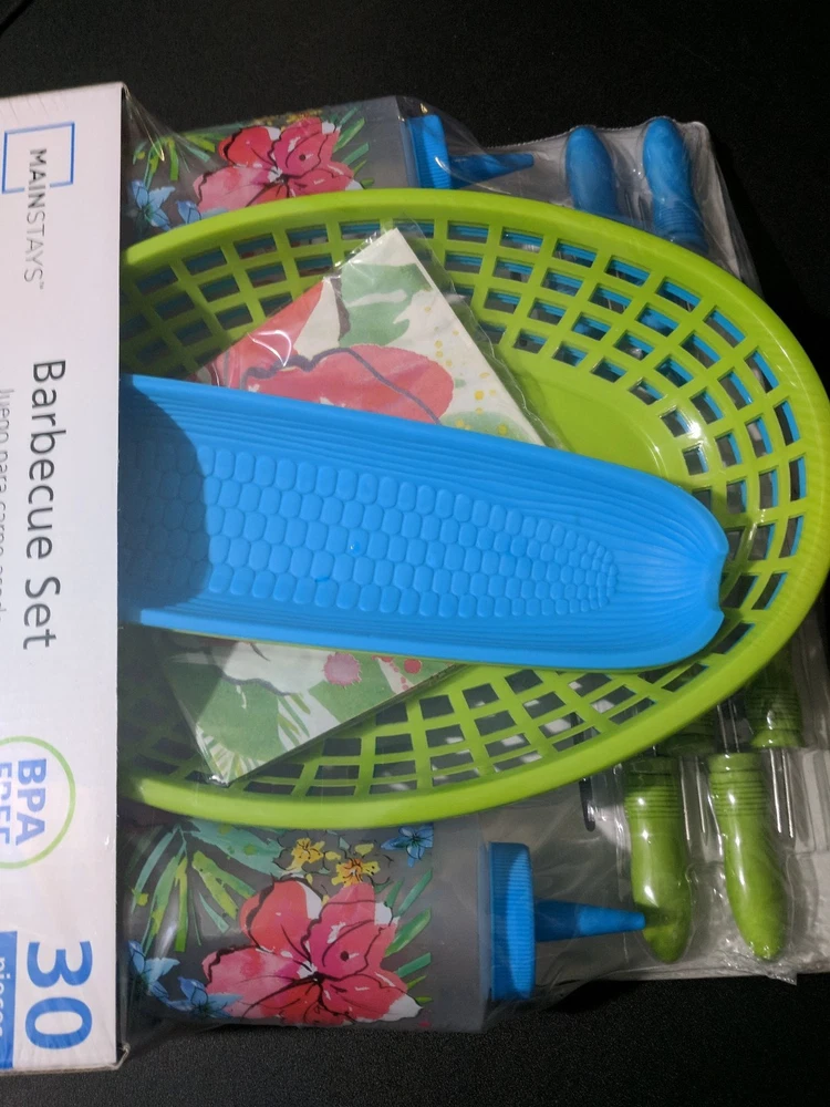 Mainstays 30 piece Barbeque set. Perfect for grilling, camping or picnicking! Also makes a great gift! Set includes: 4 corn trays 4 baskets 12 basket liners 2 condiment bottles 8 corn holders...
