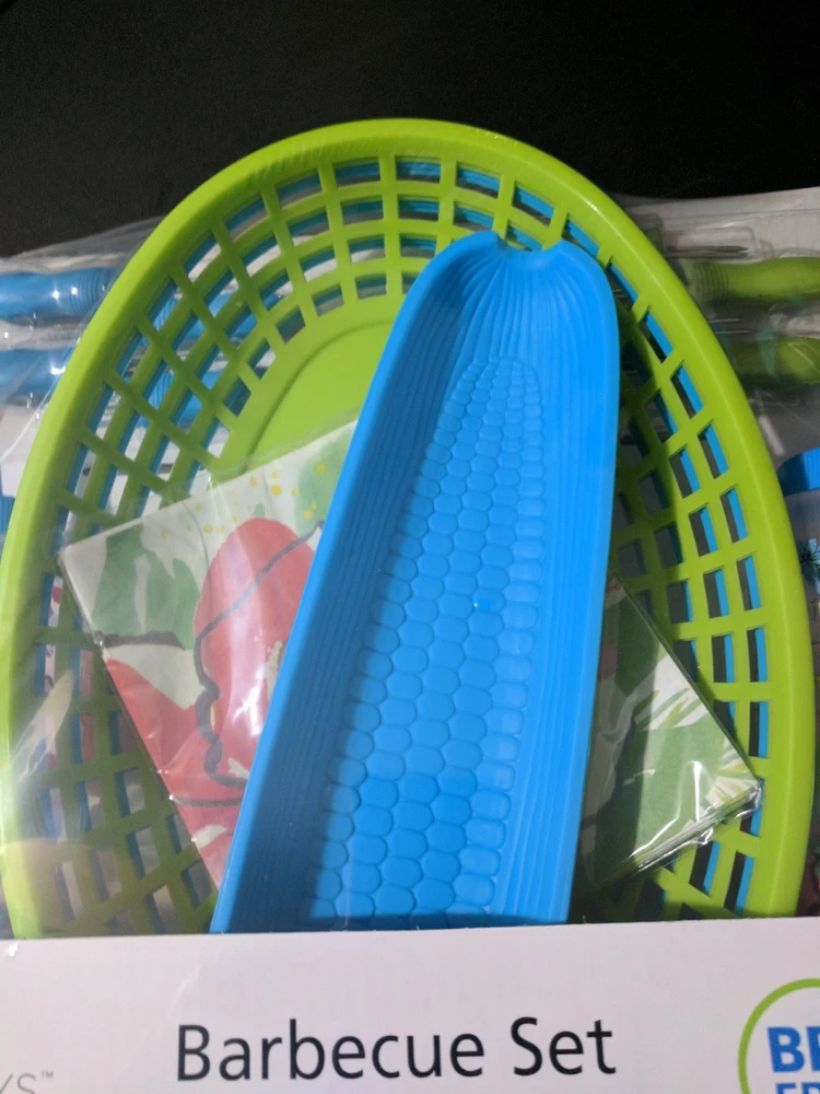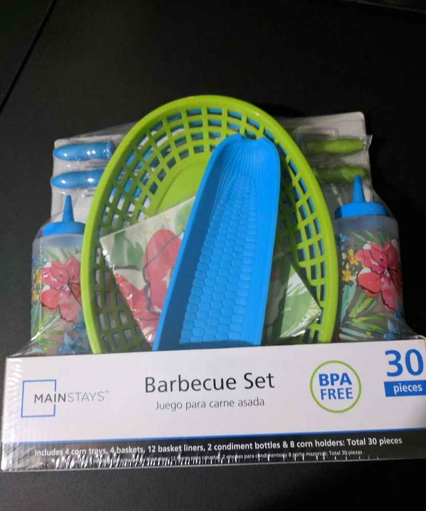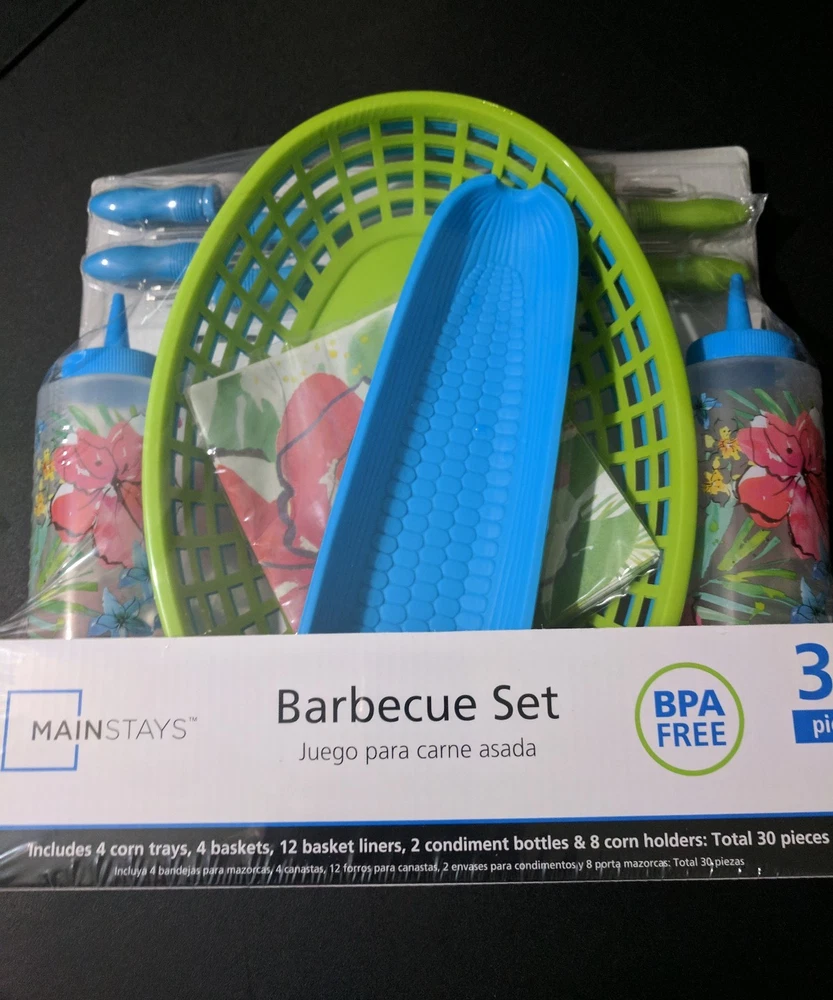 Mainstays 30 piece Barbeque set. Perfect for grilling, camping or picnicking! Also makes a great gift! Set includes: 4 corn trays 4 baskets 12 basket liners 2 condiment bottles 8 corn holders