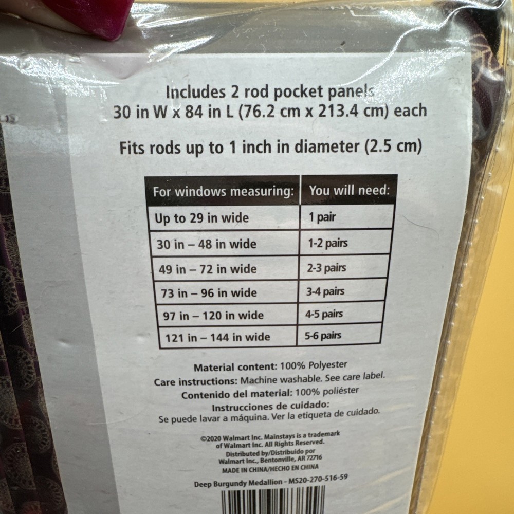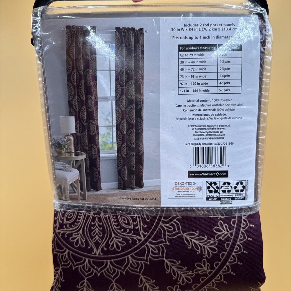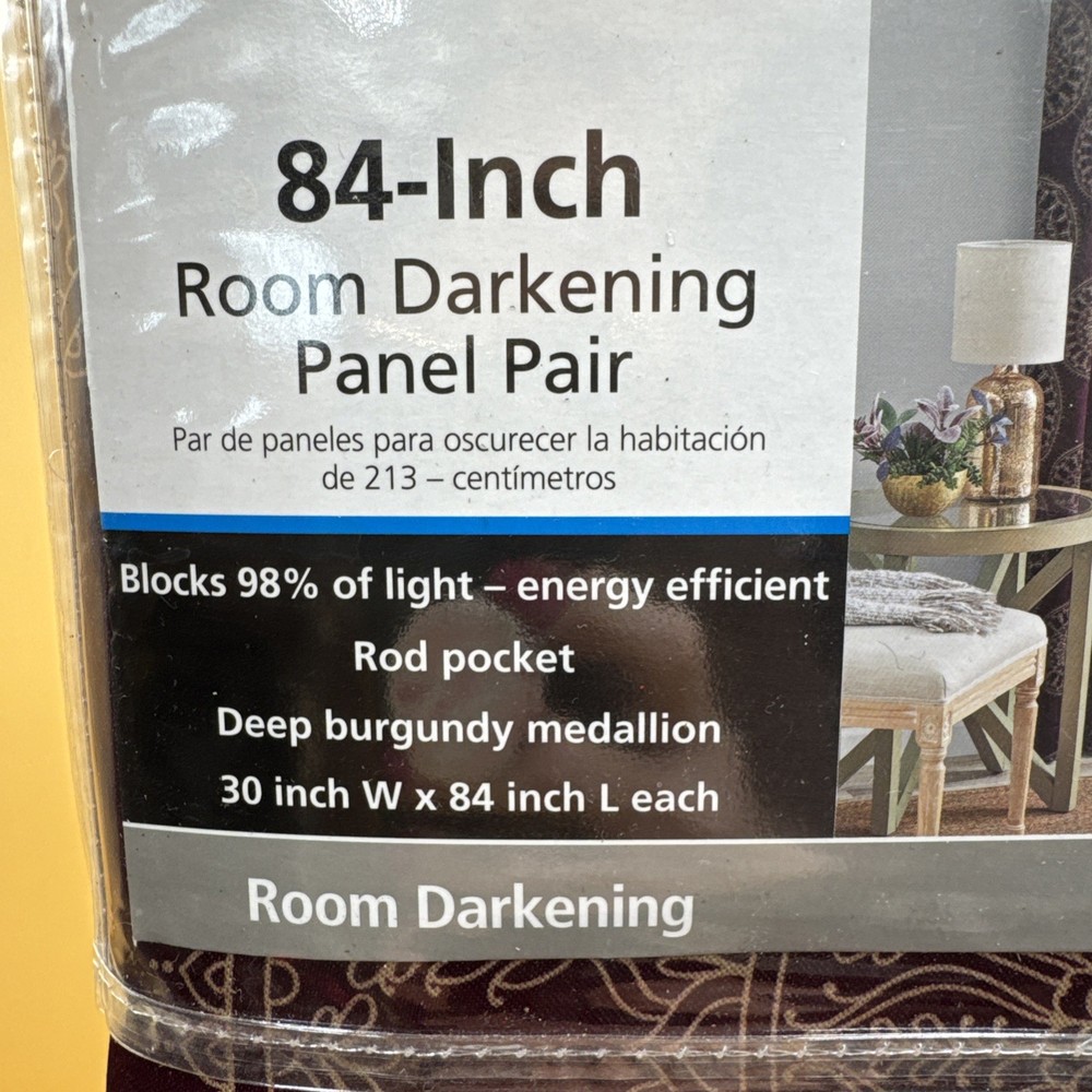 The Mainstays 30”Wx84”L Room Darkening 2 Panel Set in Deep Burgundy Medallion is a stylish and functional addition to any room. Made of durable polyester material, these panels feature a medallion pattern for a unique touch. The room darkening feature helps to reduce bright light and create a more comfortable environment. With a rod pocket heading, these curtains are easy to install and perfect for both teens and adults looking to add a touch of boho style to their space. Ideal for indoor use, this set of two panels is manufactured in China and designed for any room in the home. **FAST SHIPPING!!