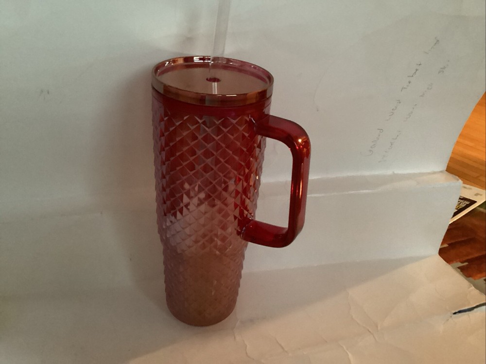 This Mainstays 30oz Textured Tumbler with Straw and Handle in Diamond Iridescent Red is the perfect addition to your kitchen collection. The tumbler is made with high-quality materials to ensure durability and long-lasting use. It comes with a straw and handle for easy and comfortable use. The tumbler's unique diamond iridescent red color adds a touch of elegance and style to your kitchen. This mug is perfect for your daily coffee or tea routine. It is designed to hold up to 30 ounces, making it ideal for large servings. The tumbler's features include a straw and handle, which make it easy to hold and sip your favorite beverage. It is also easy to clean and maintain, ensuring that it will last for years to come. Get your hands on this stylish and functional tumbler today!