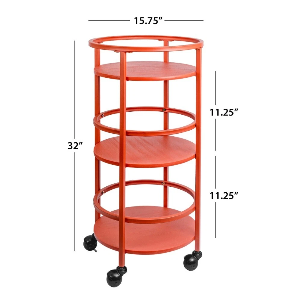 The Mainstays 32" 3-tier Round Kitchen Storage Cart is the perfect storage solution you've been looking for. Whether you need extra space for kitchen snacks, office craft supplies, bathroom toiletries, or even as a trendy bar cart, this item has you covered. The cart features three round shelves with guardrails to keep products in place. Four lockable casters allow for the cart to be displayed as an accent piece or conveniently be moved away and stored in a small space. Available in 3 colors. Mainstays 3 Tier Utility Cart Multi Functional small space storage solution Great for bathrooms, laundry room, bar & more; Dimensions: 15.75" L x 15.75" W x 32" H Includes 4 smooth and lockable casters Durable frame Shelf diameter 13.875" Shelf Spacing 12" 9.68lb