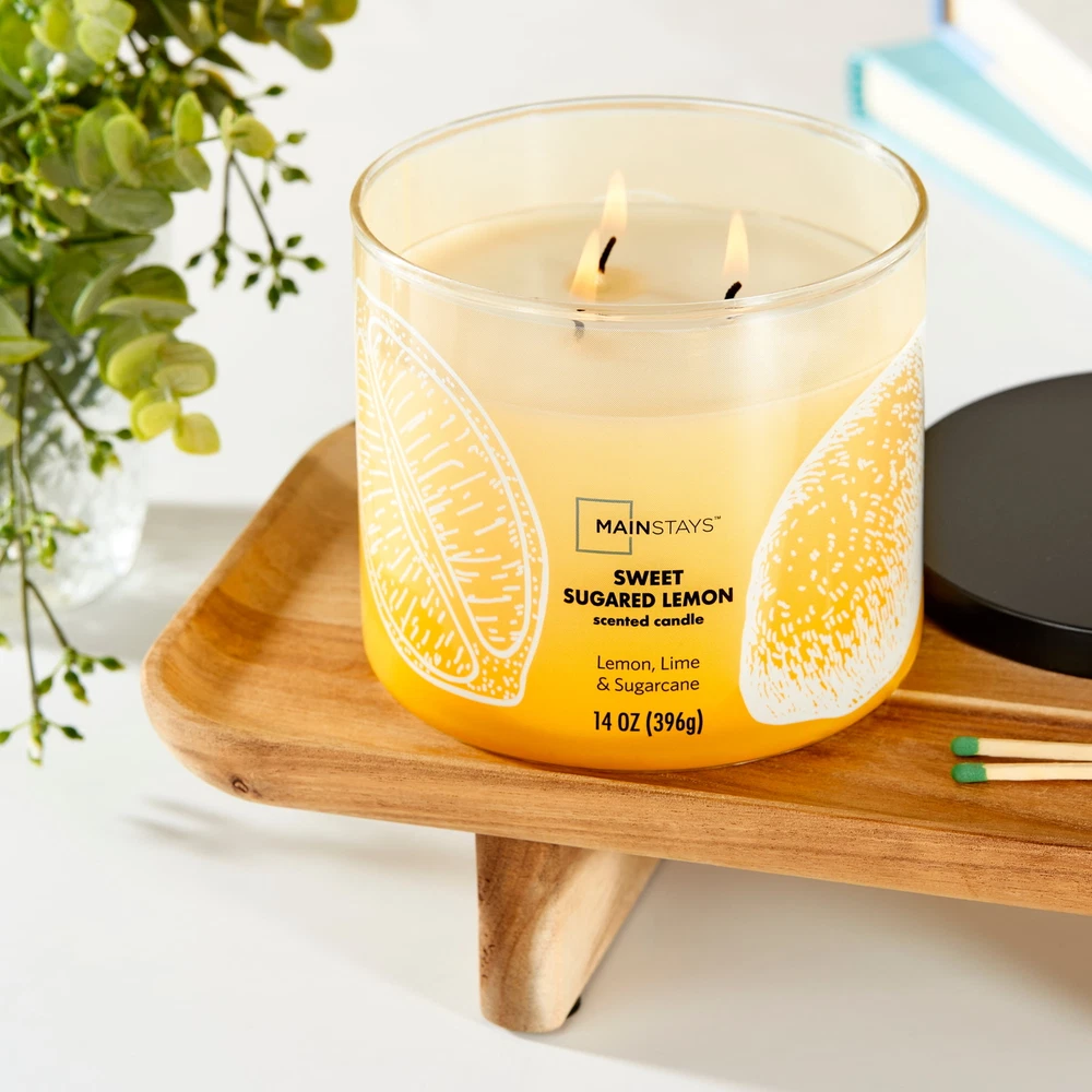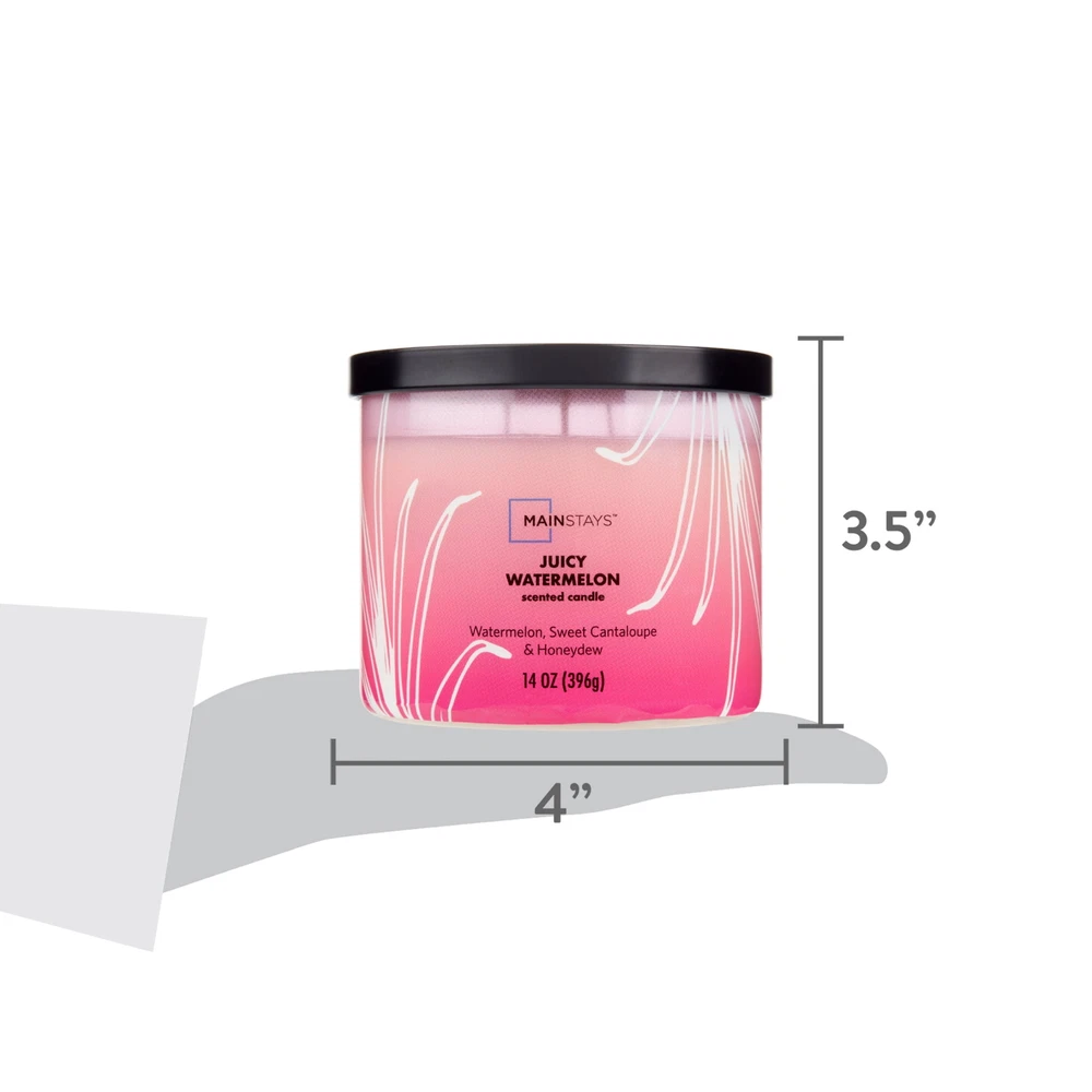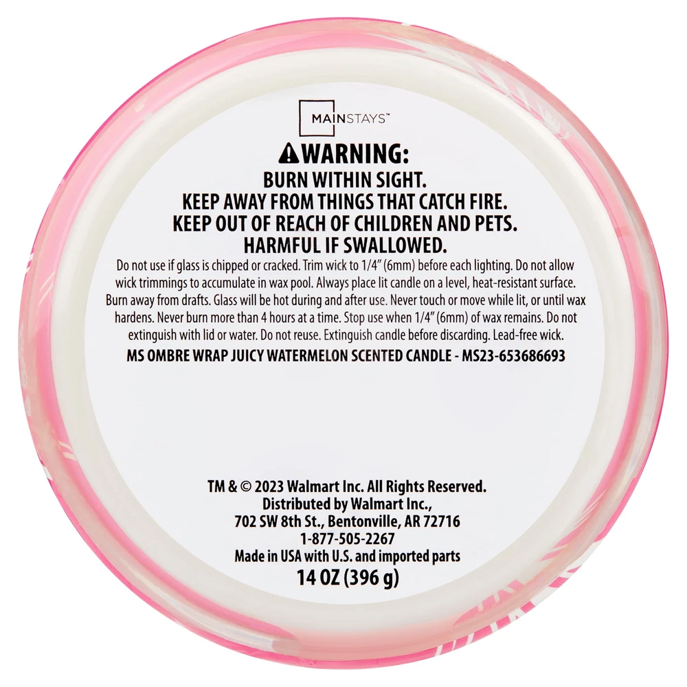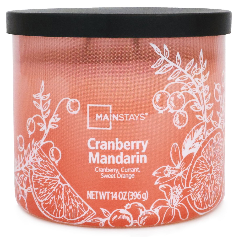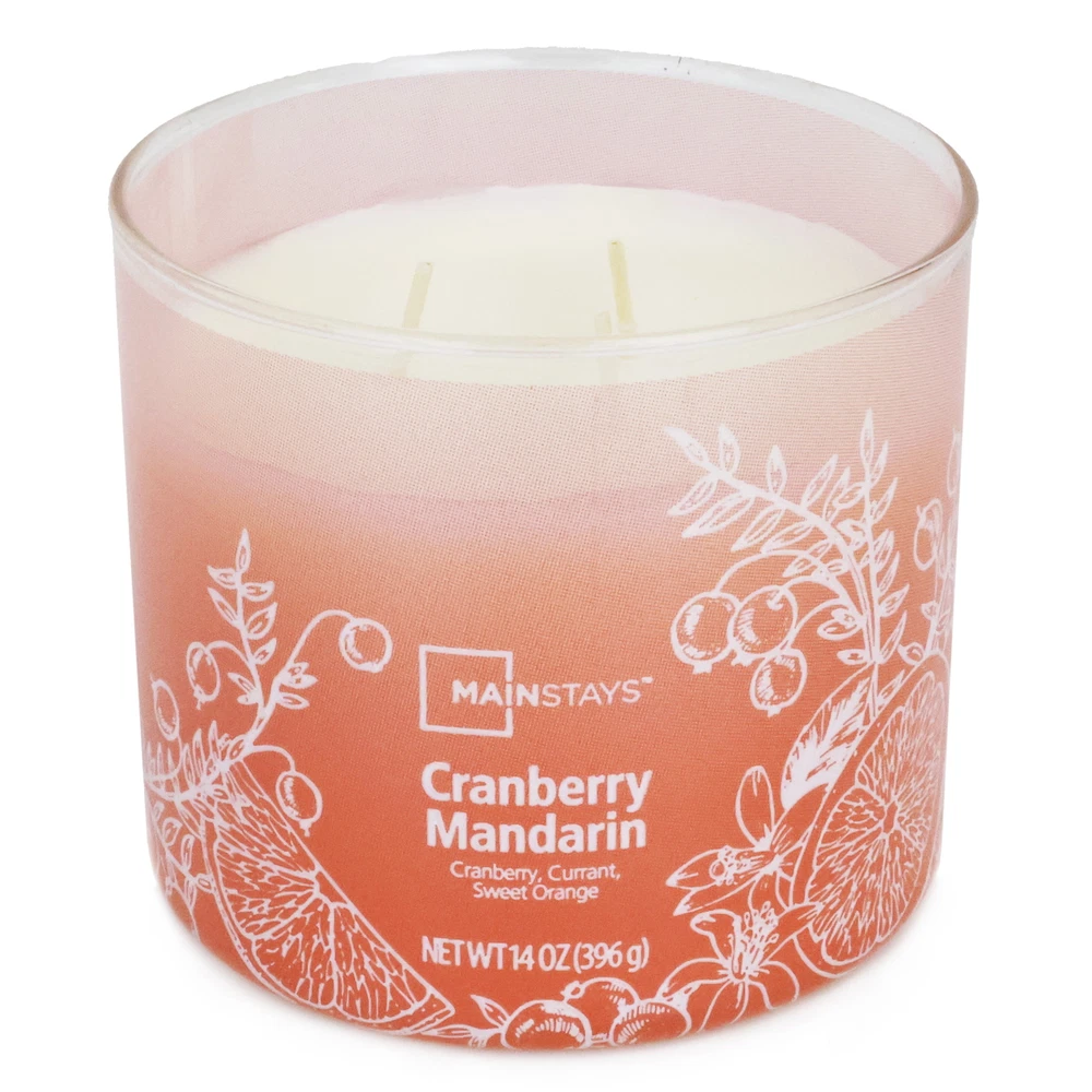 Mainstays 3-Wick Ombre Wrap Cranberry Mandarin Scented Candle Consistent and smooth burn Lead-free wick and self-extinguishing sustainer 3-wick with decorative wrap with attractive metal lid Highly fragranced candle Follow these tips for the perfect burn: Always trim wick to ¼ inch before lighting and keep debris out of wax pool Do not burn more than 3 hours at one use, and allow wax to harden before relighting, touching or moving. Set candle on a heat-resistant surface and keep out of drafts. Always burn within sight and extinguish before leaving room. Do not burn near things that can catch fire, and keep away from children and pets. Do not extinguish with water. No assembly required Perfect for any room in your home Recyclable vessel Great for gift giving or keep for yourself Cranberry Mandarin - This scented 3-wick wrapped candle from Mainstays is a highly fragranced candle that is poured with a premium wax blend that allows for a smooth, consistent burn. These Mainstays scented candles are packaged in a decorative glass jar with metal lid in a variety of fragrances and designs that will go well with all your current home decor. The candles have a lead-free wick and are poured in the USA.