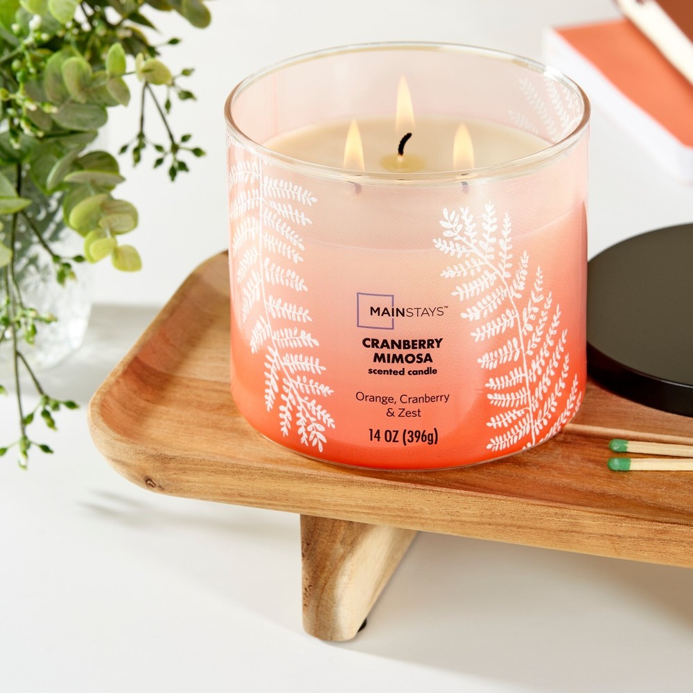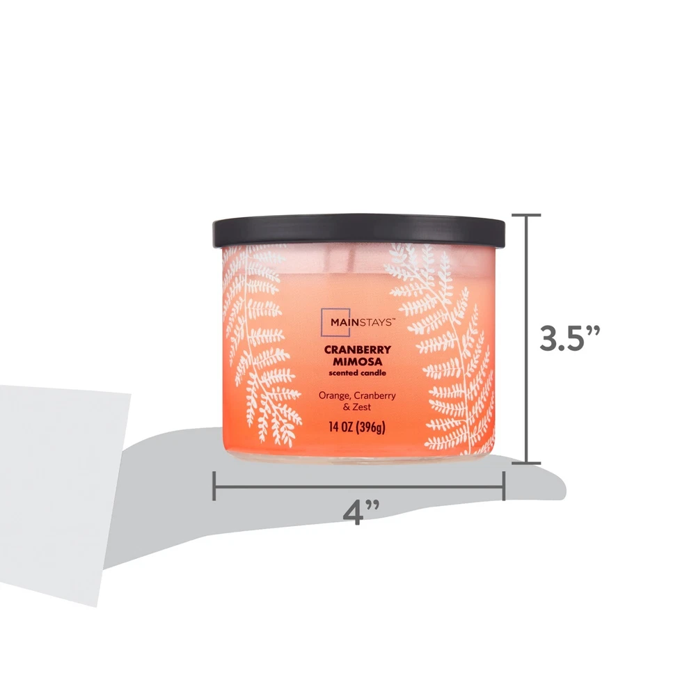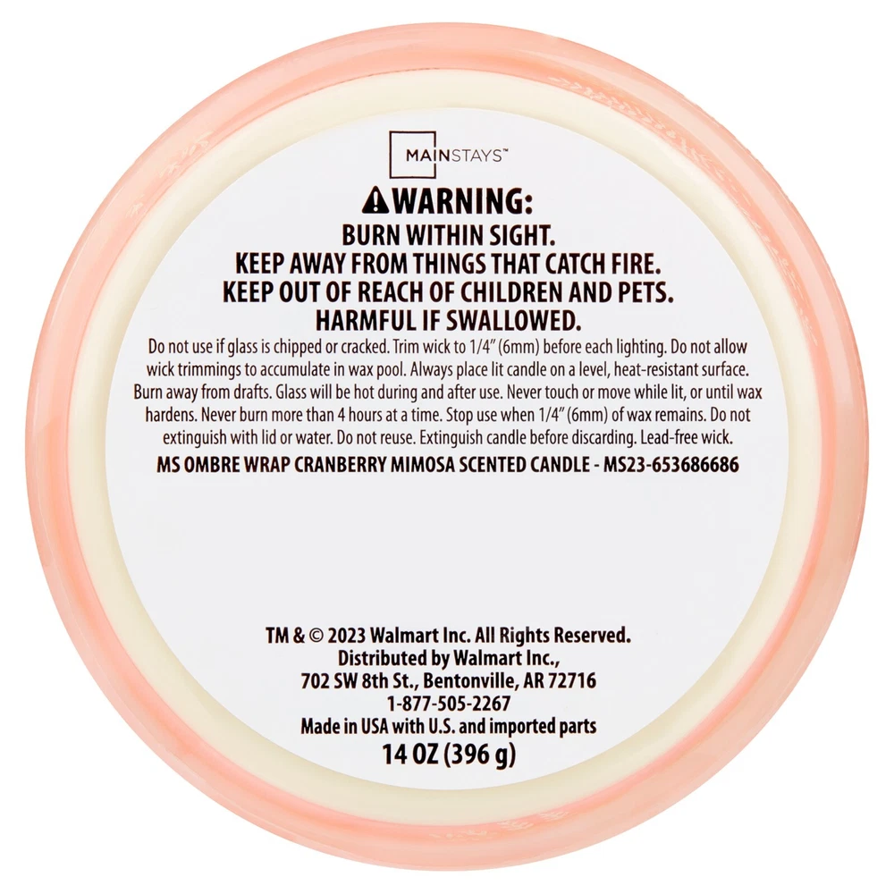 Mainstays 3-Wick Ombre Wrap Cranberry Mimosa Candle, 14-Ounce Description: Cranberry Mimosa - This scented 3-wick wrapped candle from Mainstays is a highly fragranced candle that is poured with a premium wax blend that allows for a smooth, consistent burn. These Mainstays scented candles are packaged in a decorative glass jar with metal lid in a variety of fragrances and designs that will go well with all your current home decor. The candles have a lead-free wick and are poured in the USA. Follow these tips for the perfect burn: Always trim wick to ¼ inch before lighting and keep debris out of wax pool Do not burn more than 3 hours at one use, and allow wax to harden before relighting, touching or moving. Set candle on a heat-resistant surface and keep out of drafts. Always burn within sight and extinguish before leaving room. Do not burn near things that can catch fire, and keep away from children and pets. Do not extinguish with water. No assembly required Perfect for any room in your home Recyclable vessel Great for gift giving or keep for yourself THANK YOU!