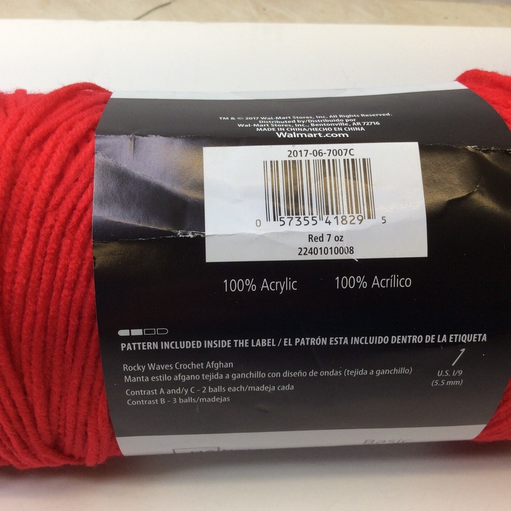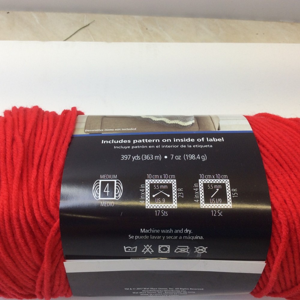 Mainstays #4 Acrylic Yarn One 7oz Skein Red Walmart NEW This Mainstays acrylic yarn skein in rich red is perfect for your crafting needs. With a weight of 4, it's ideal for a wide range of projects such as gloves/mittens, hats, scarves, blankets and throws and can be used for both practical and decorative purposes. The fiber content is 100% acrylic, making it easy to care for and durable enough to withstand everyday use. Whether you're a beginner or an experienced crafter, this 4-ply yarn is a must-have in your collection. The skein is brand new from Walmart and can be used for a variety of projects. With its vibrant color and versatile use, this yarn is perfect for adding a pop of color to any project.