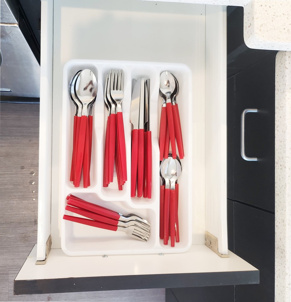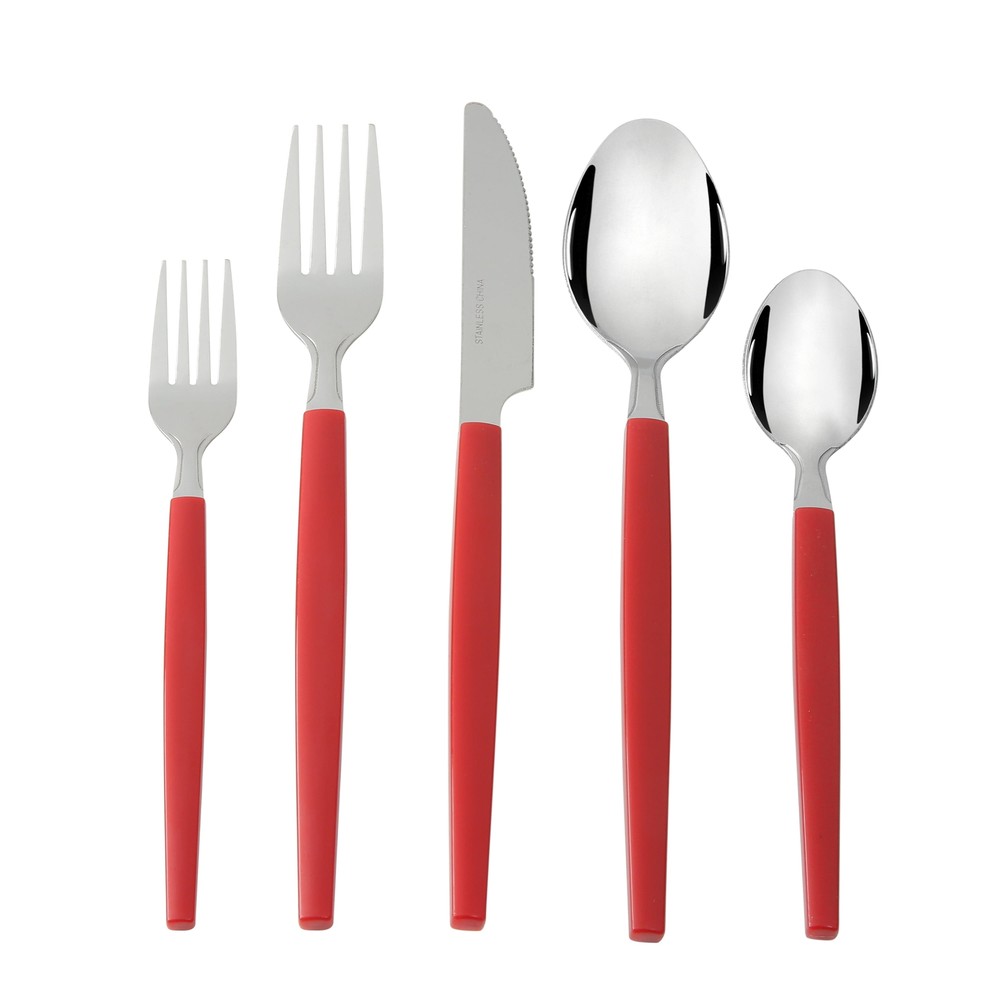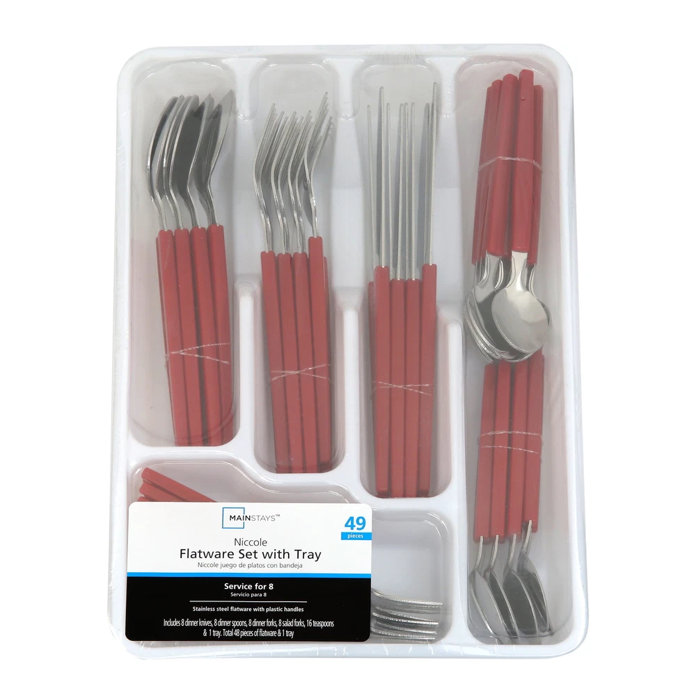 Product details The Mainstays 49 piece flatware set in Niccole Red provides service for 8 people. The set includes ergonomically designed stainless steel utensils with durable colored plastic handles that add style to any table. Perfect for home, college dining, picnics, camping, and outdoor eating, this affordable flatware set includes 8 each of dinner forks, salad forks, tablespoons, and knives and 16 teaspoons. Dishwasher safe for easy cleanup. The included plastic tray neatly organizes all 49 pieces for compact storage. Quality and convenience make this flatware set ideal for any situation from everyday to outdoor dining. Weighs 2.6lbs Set includes 49 pieces total - 8 each of dinner forks, salad forks, tablespoons, knives, 16 teaspoons, and storage tray Includes plastic tray for neat and organized storage Ergonomic handle design for comfortable grip, Ideal for home, college, picnics, camping, RV trips, and outdoor dining Dishwasher safe for easy cleanup Stainless steel utensils with durable colored plastic handles in red Weight: 2.6lbs