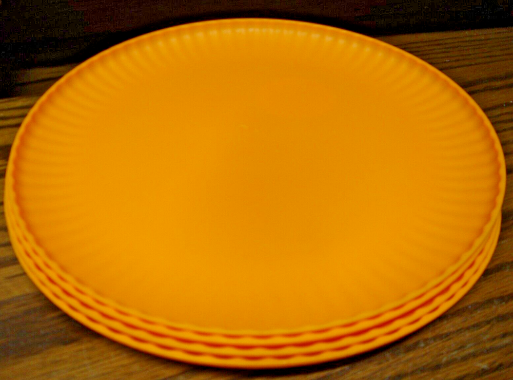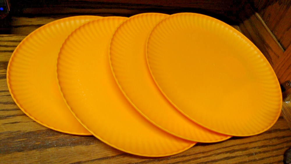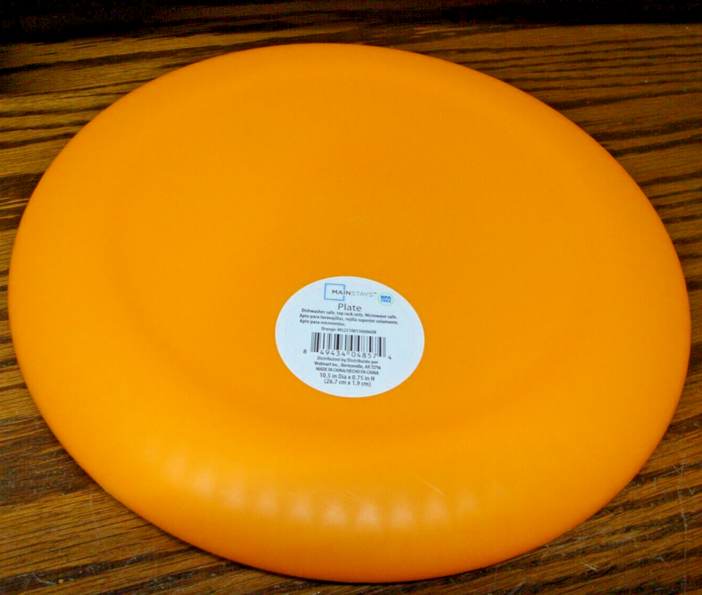 The Mainstays 4-piece Plastic Dinner Plates are 10.5 inches in diameter and feature a round shape with a ribbed border. The plates are a vibrant orange color and made of break-resistant and dishwasher-safe plastic, making them ideal for everyday use. This contemporary-style dinnerware set is suitable for all occasions, and each plate is lightweight and easy to handle. Perfect for both teens and adults, these plates add a bright pop of color to any dining table.