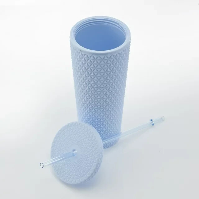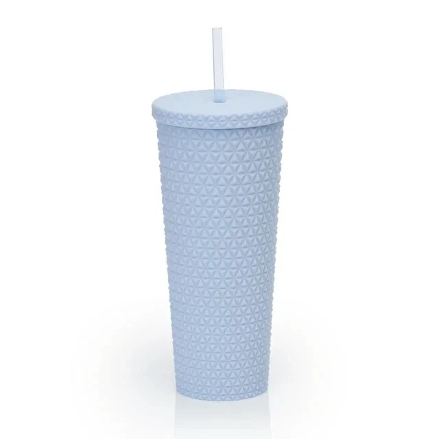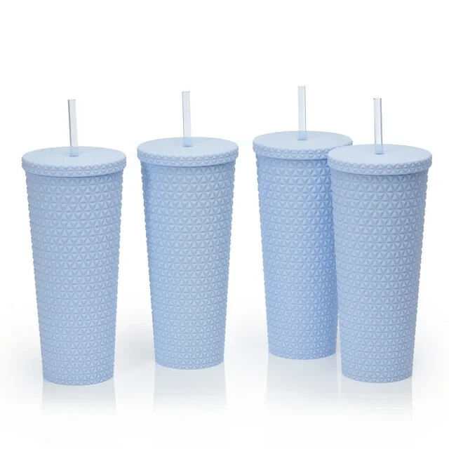 Mainstays 4pk 26oz DW AS Plastic Soft Touch Textured Tumbler, Blue This Holiday Time 26oz Double Wall AS Plastic Soft Touch Textured Tumbler is made of BPA free AS material and has total 5 tranditional Christmas colors: red/ green/ pink/ white/ blue available for your selection. Available in multiple color options so you can mix and match. It is reusable and easy to wash. It is with a PETG straw, twist lid, popular pyramid textured design and fashionable matte soft touch finish which could give you a pleasant using experience when you are using it with cold drinks. The 26oz capacity is convenient for carrying more of your favorite drinks. The double-wall design isolates the liquid inside, so it means your drink will retain its original temperature longer than ever. The tinted finish makes the Christmas colors stand out. Add these unique tumblers to your Christmas collection today! 5 colors available: red/green/pink/white/blue. Made of AS and PETG (straw) material. With a most popular capacity of 26oz BPA free and reusable. Double wall sweat free design prevents condensation and keeps cold beverages cold for hours. Fashionable pyramid textured design. Twist lid with silicone seal ring. Matte soft touch finish. Assembled Product Weight 322 g Features Leak-proof, spill resistant Size One Size Count 1 Color Soft Touch Blue Assembled Product Dimensions (L x W x H) 4.09 x 4.09 x 8.94 Inches