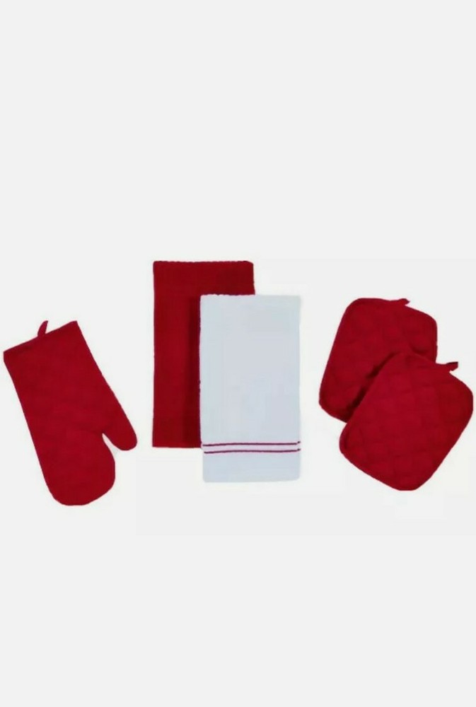 Mainstays 5 Piece Kitchen Set with Towels Jumbo Oven Mitt & Potholders RED New....