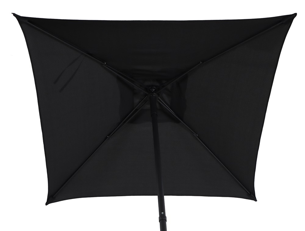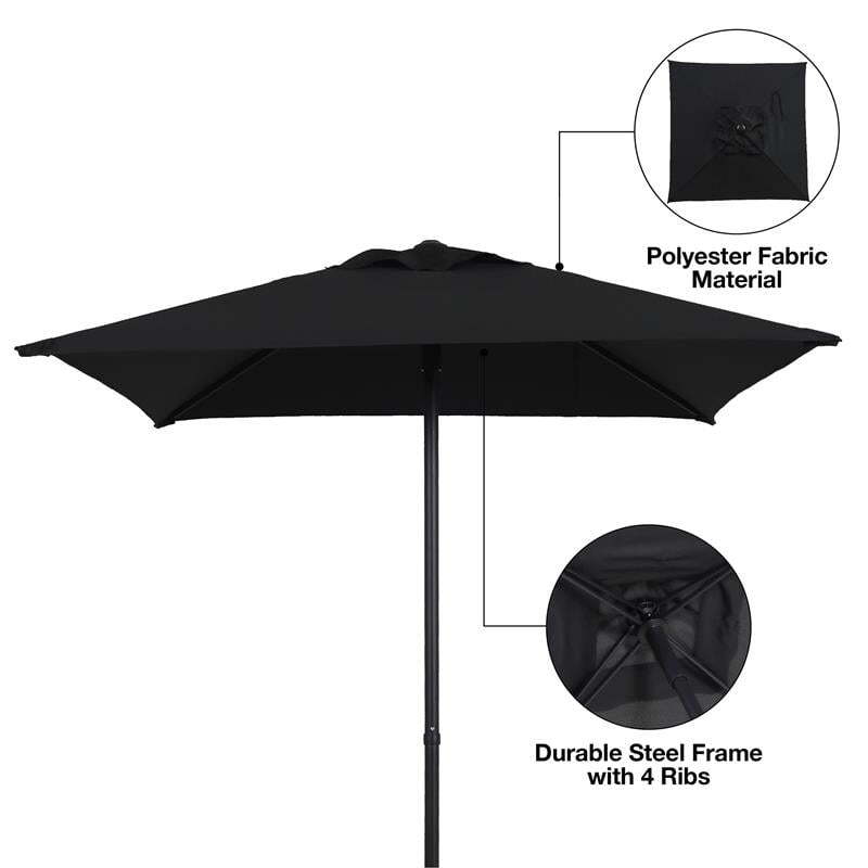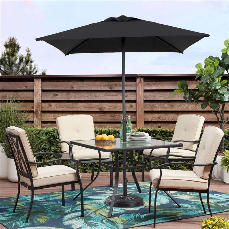 Mainstays 5' Square Black Patio Umbrella, Push-Up Function Product details The Mainstays outdoor 5 foot market patio umbrella features a manual push-up function to open the canopy. This is a non-tilting umbrella, perfect for small spaces. Made with weather and fade-resistant 50% recycled polyester fabric and a powder coated steel frame. For use either through a table with a 26lb base or freestanding with a 75 lb. base. Please insure you always use an umbrella base to secure your umbrella and close when not in use to prevent damage. Push-up feature easily opens the umbrella Offers protection from bright sunrays Push the umbrella upward for easy opening Does Not Tilt Fabric made from fade-resistant 50% recycled polyester fabric Durable and strong powder-coated steel frame and 4 steel ribs helps extend the life of the umbrella Supplies enough coverage for a 4 person table Can be used either through a table with a 26lb base or freestanding with a 75lb base Base not included Care: Spot clean with mild soap and water, do not bleach Overall dimension: 59" x 59" x 84.6" (L x W x H) Product weight: 6.5lbs Matching storage bag included Manufacturer number: MS5608811816010 Color: Black Shipping We offer FREE shipping on all orders! We ship within Three business days of payment, usually sooner. We use a selection of shipping services such as UPS, FedEx, USPS etc. We only ship to the lower 48 states, no APO/FPO addresses or PO Boxes allowed. Local pickups and combined shipping options are not provided at this time. Return You can return a product for up to 30 days from the date you purchased it. Any product you return must be in the same condition you received it and in the original packaging. Please keep the receipt. Payment We accept payment by any of the following methods: PayPal Please pay as soon as possible after winning an auction, as that will allow us to post your item to you sooner! Feedback Customer satisfaction is very important to us. If you have any problem with your order, please contact us and we will do our best to make you satisfied. Contact Us If you have any queries, please contact us via ebay. We usually respond within 24 hours on weekdays. Please visit our eBay store to check out other items for sale! Thank you for shopping at our store.