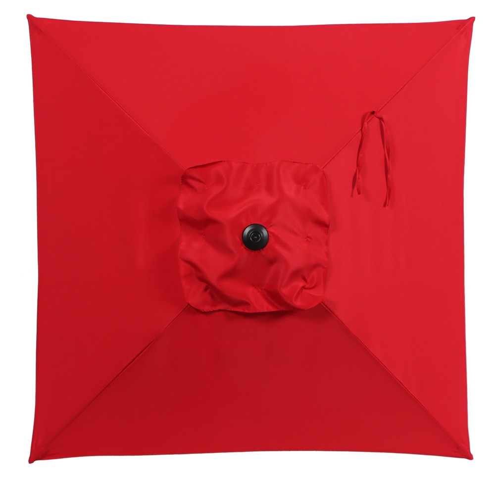 The Mainstays outdoor 5 foot market patio umbrella features a manual push-up function to open the canopy. This is a non-tilting umbrella, perfect for small spaces. Made with weather and fade-resistant 50% recycled polyester fabric and a powder coated steel frame. For use either through a table with a 26lb base or freestanding with a 75 lb. base. Please insure you always use an umbrella base to secure your umbrella and close when not in use to prevent damage. Push-up lift feature easily opens the umbrella Does Not Tilt Fade-resistant polyester, 50% recycled fabric ensures long-lasting use Durable and strong powder-coated steel frame and 4 steel rib help extend the life of the umbrella Supplies enough coverage for a 4-person table Can be used either through a table with a 26lb base or freestanding with a 75lb base Base not included Care: Spot clean with mild soap and water, do not bleach Overall dimension: 59" x 59" x 84.6" (L x W x H Product weight: 6.5 lbs. Matching storage bag included Color: Red