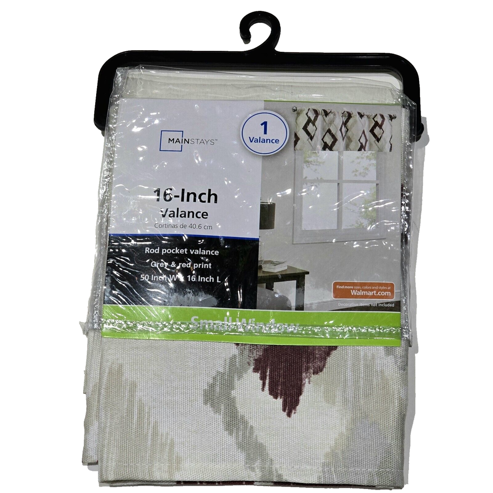 Mainstays 50x16in L Valance Grey & Red Print Small Window Rod Pocket
