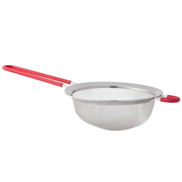 Complete your collection of everyday kitchen gadgets with the Mainstays Fine Mesh Strainer Basket. Designed with home chefs in mind, this handheld strainer with a 6-inch diameter straining basket is perfect for washing fruits and vegetables, rinsing beans and other canned goods, dusting baked goods with powdered sugar, separating seeds, and more. It efficiently catches small morsels while allowing liquids and fine ingredients to filter through. With a lightweight design and secure hook along the wire frame, this strainer offers busy cooks extended hands-free straining with the ability to hang it on the rims of bowls and cookware. The ergonomic nonslip handle offers a firm and comfortable hold. Constructed with durable stainless steel, the strainer is built to last and is top-rack dishwasher safe for a quick and easy clean up after use. Build your kitchen from the ground up with all the cookware, bakeware, tools, dinnerware and other items you need to create a useful cooking and dining arrangement. The Mainstays kitchen collection focuses on colorful and decorative design applied to simple basics, keeping your daily life vibrant and efficient. Ideal for sifting flour, straining sauces, rinsing rice and beans, and much more. Catches small particles, scraps, and seeds while letting liquids drain through. Can also be used for washing small amounts of various fruits, veggies, and herbs. Non-slip red-colored silicone handle provides a firm and comfortable grip. Fine mesh strainer basket has a convenient diameter of 6"
