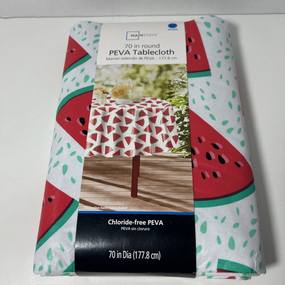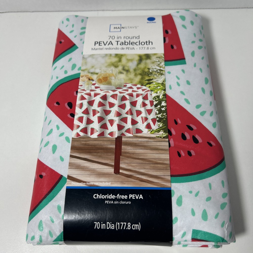 Mainstays 70” Round PEVA Vinyl Lemons & Blue Watermelon Tablecloths- Spring Fun. Bin: 105...