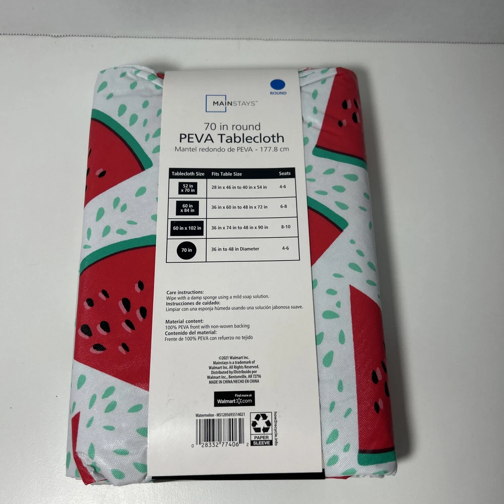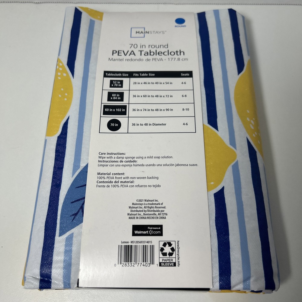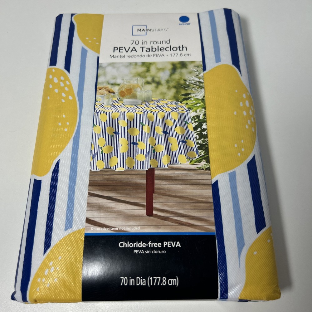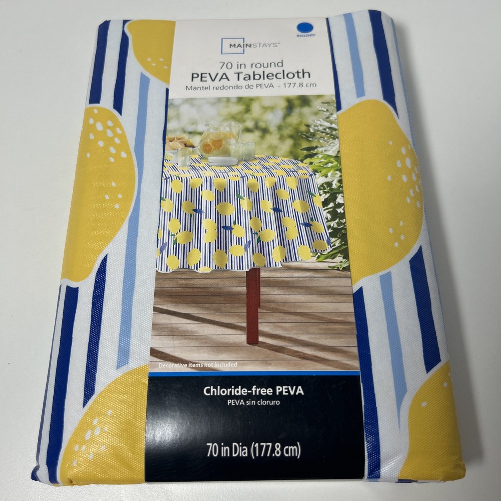 Mainstays 70” Round PEVA Vinyl Lemons & Blue Watermelon Tablecloths- Spring Fun. Bin: 105