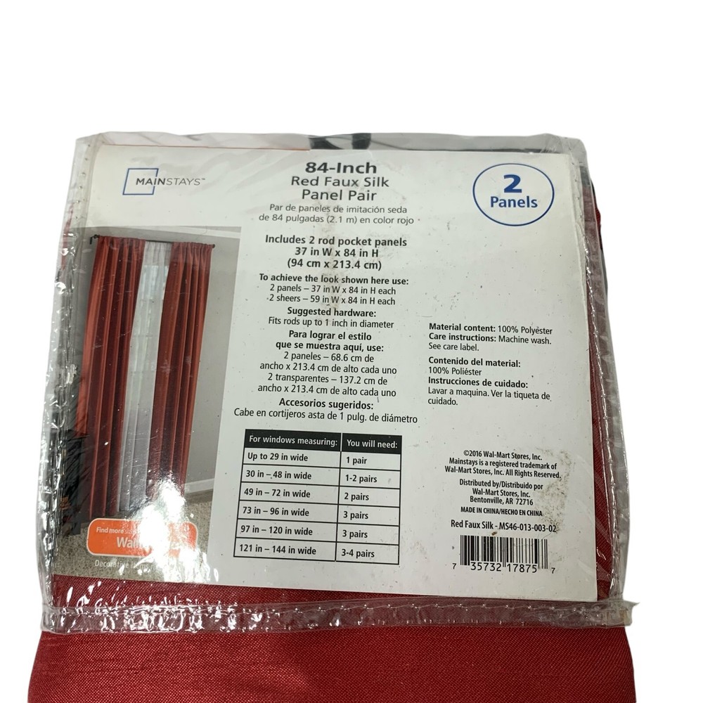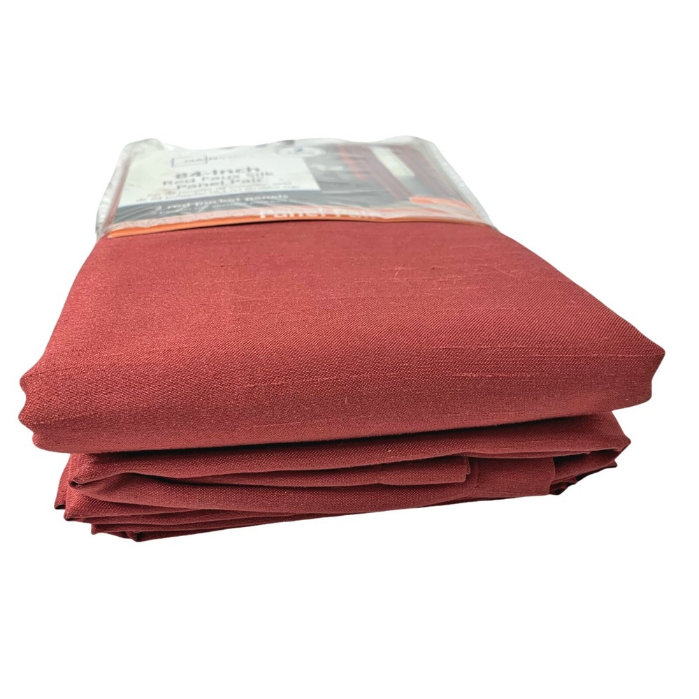 Mainstays 84-Inch Textured Curtain Panel - Set of 2 packages Rod Pocket Panel Red Faux Silk 100% Polyester 37" W x 84" Leaf Fits rod up to 1" in diameter New in package. Two Panels in each package. Th...
