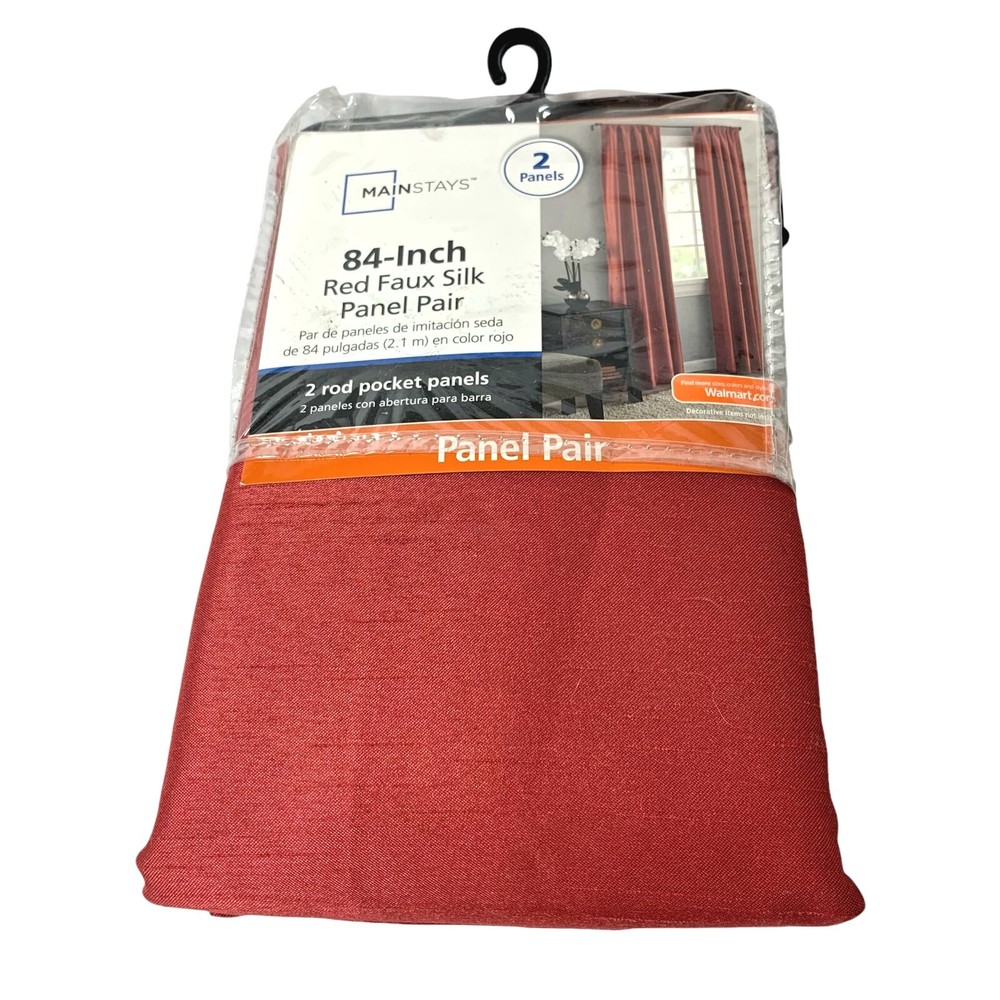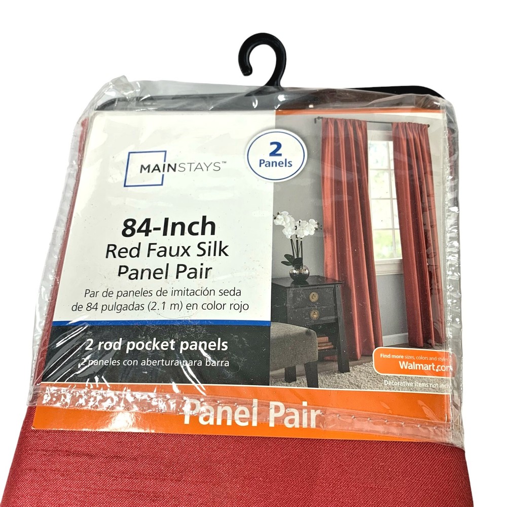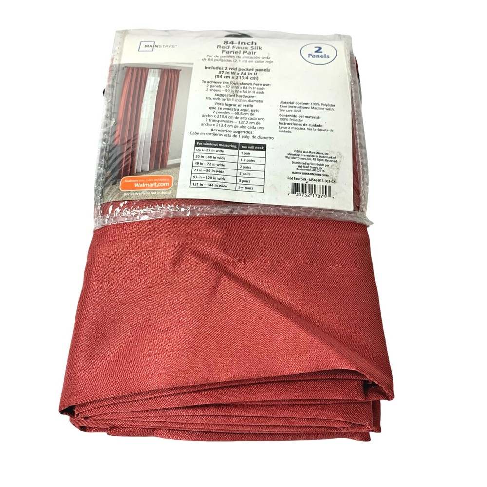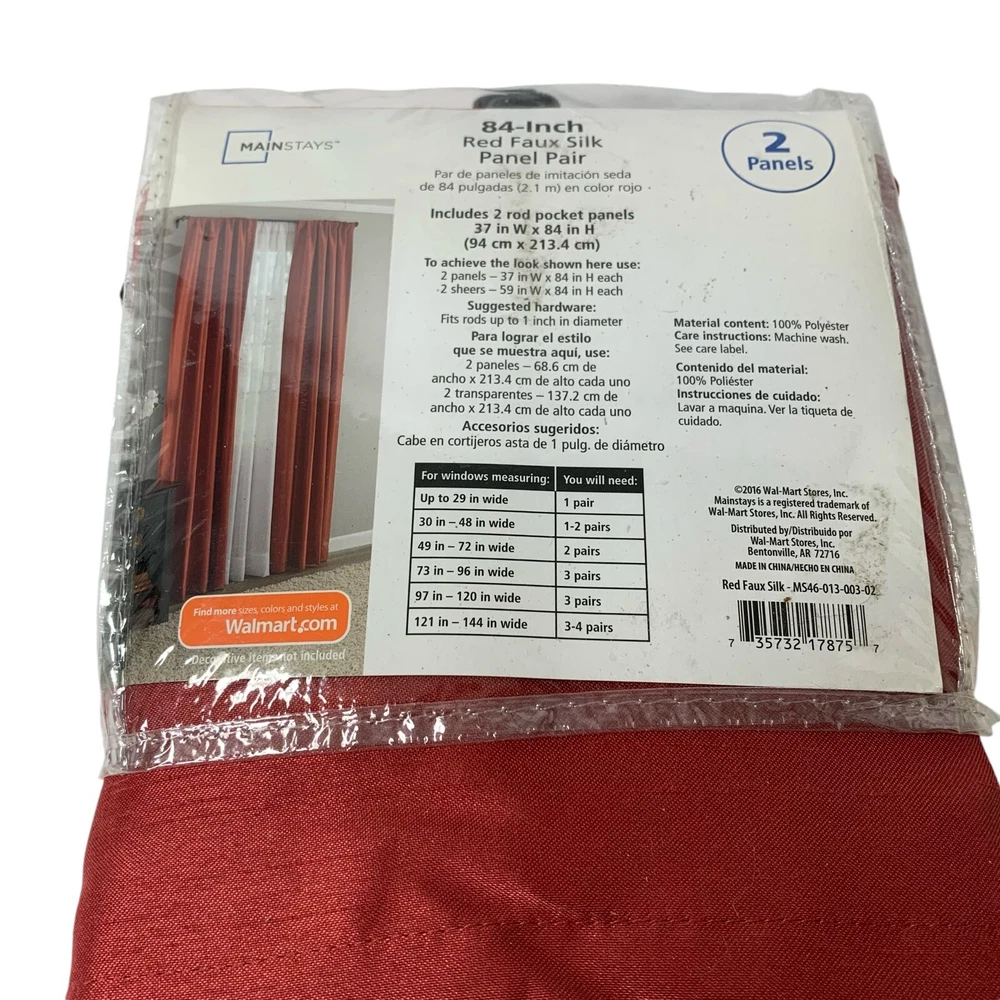 Mainstays 84-Inch Textured Curtain Panel - Set of 2 packages Rod Pocket Panel Red Faux Silk 100% Polyester 37" W x 84" Leaf Fits rod up to 1" in diameter New in package. Two Panels in each package. Thank you for Looking!