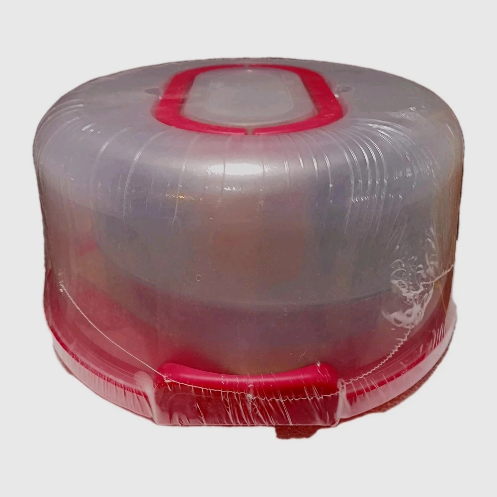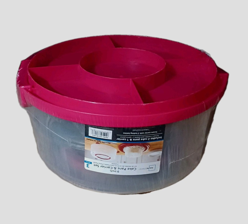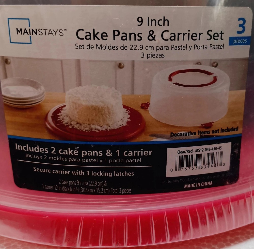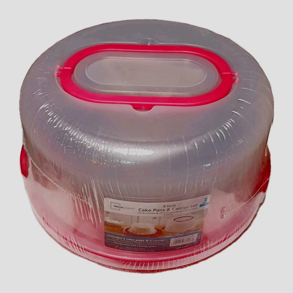 New still in the plastic. This three-piece set from Mainstays includes two 9-inch round cake pans and a secure carrier. The pans are made of carbon steel and have a non-stick surface coating. The carrier is heavy plastic with a clear top and a red bottom & 2 red extra large handles on top. It features three locks to keep the cakes safe and easy to transport. The set is dishwasher safe, but do not use metal utensils on the cake pans. The set is suitable for electric and gas ovens up to 550°F. The carrier has two extra-large handles on the top for easy carrying.