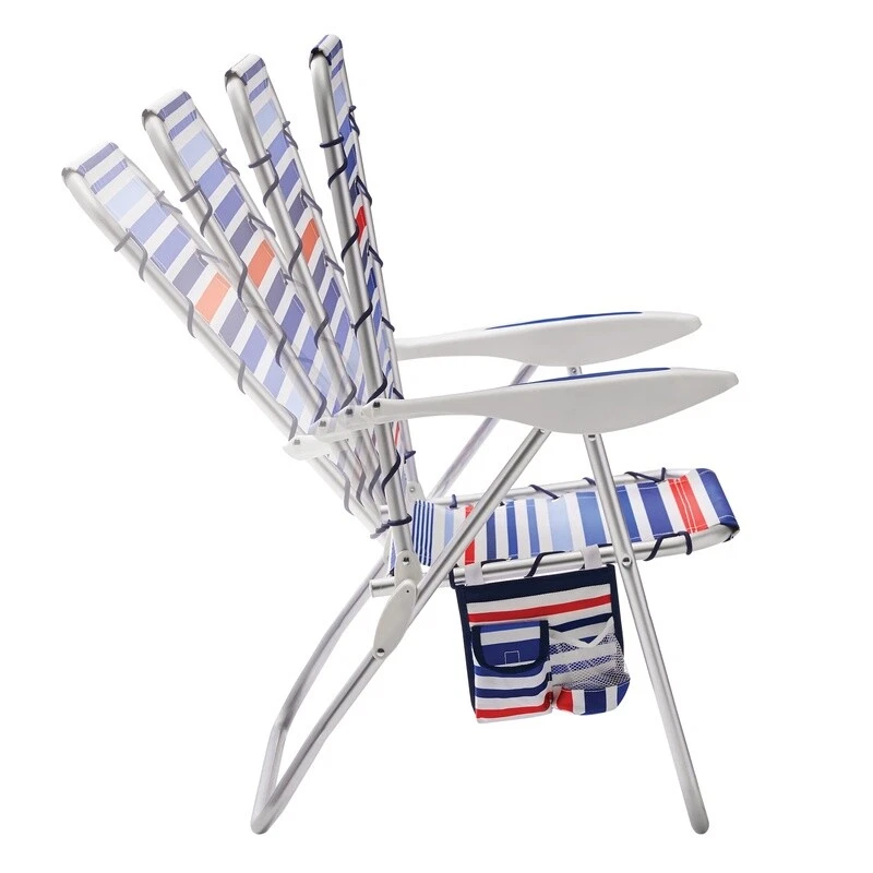 This might be the most perfect chair for any location, it is our comfortable Mainstays Reclining Portable Bungee Beach Chair. This chair features a lightweight and rustproof aluminum frame with a red, white and blue covering in a durable and weather-resistant polyester fabric. Bungee cords are used to attach the fabric to the frame, providing additional "suspension" comfort. Use the oversize two-color stay-cool resin arms to recline to one of four available positions. A convenient dual compartment drink, cell phone, and key storage pocket is attached. The seat height is just over 15 inches for easy in and out and supports up to 225 pounds. The chair folds flat for storage and it's weight of just over 7 pounds makes it easy to take anywhere. Take it to the beach, park, camping, or use at home in the backyard,on the deck or the patio. Our folding bungee chair will keep you comportable wherever you go. Lightweight and rustproof aluminum frame Red, white & blue durable weather-resistant polyester fabric 4 reclining positions Bungee suspension for improved comfort Drink and cell phone holder Two-tone stay-cool resin arms Carry handles Folds flat for compact storage Weight capacity up to 225 Pounds Features Adjustable, Folding, Rust Resistant Brand Mainstays Color Red/White/Blue Material Aluminum; Steel; Polyester; Plastic Assembled Product Weight 7.1 lb Recommended Location Outdoor Assembled Product Dimensions (L x W x H) 31.89 x 24.21 x 37.00 Inches