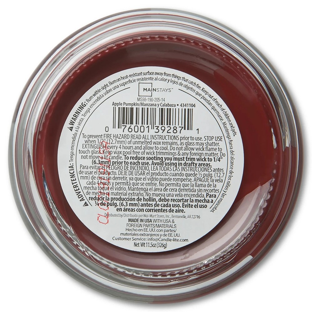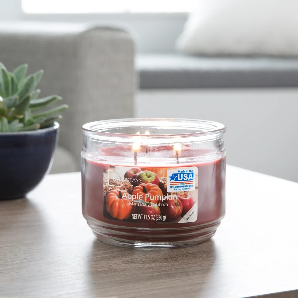 Mainstays Apple Pumpkin 3-Wick 11.5 oz Scented Candle Macintosh Apple whipped with warm apple butter and sweet cinnamon sugar are wrapped with maple syrup and brown sugar vanilla for a rich autumn sensation. Premium-grade paraffin wax blended with premium quality ingredients to create distinctive true-to-life scents Clear glass container complements virtually any room décor and provides just the right amount of illumination with a 3-wick design Pleasant scent for a relaxing environment without becoming overpowering. Helps improve concentration, mood, and positive thinking Product measures 4.12" D x 3.2" H Product weighs 1.37 lbs
