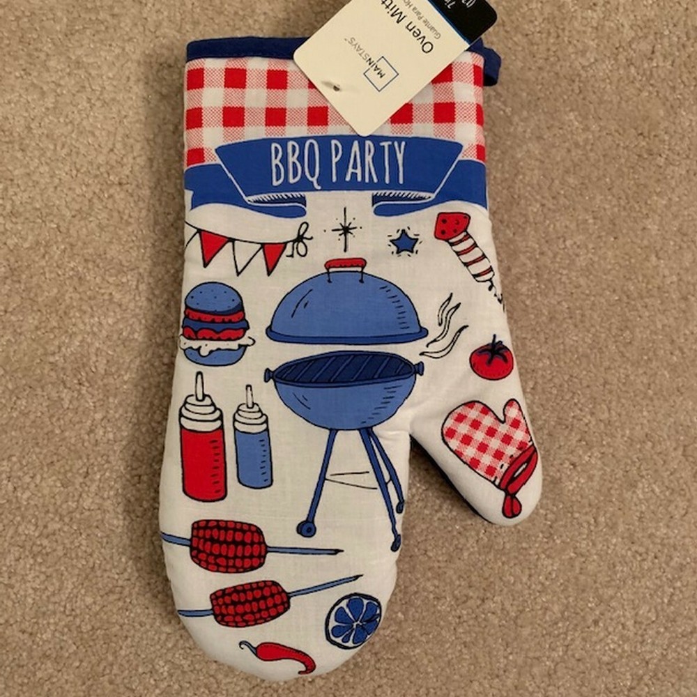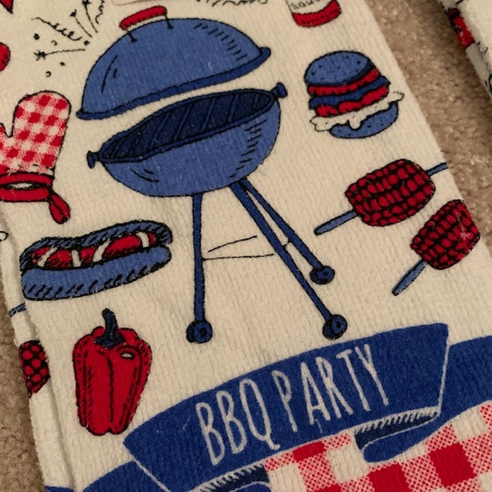Mainstays Barbeque Themed Kitchen Towels and Oven Mitt Red, White and Blue Colors Set of 2 Towels - 100% Cotton - 15" x 25" Oven Mitt - 7" x 11" Machine Wash and Dry Brand new with tags Smoke free home