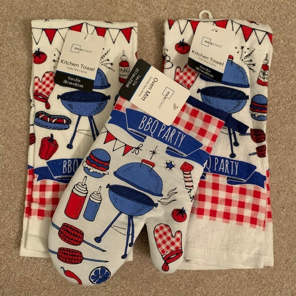 Mainstays Barbeque Themed Kitchen Towels and Oven Mitt Red, White and Blue Colors Set of 2 Towels - 100% Cotton - 15" x 25" Oven Mitt - 7" x 11" Machine Wash and Dry Brand new with tags Smoke free hom...