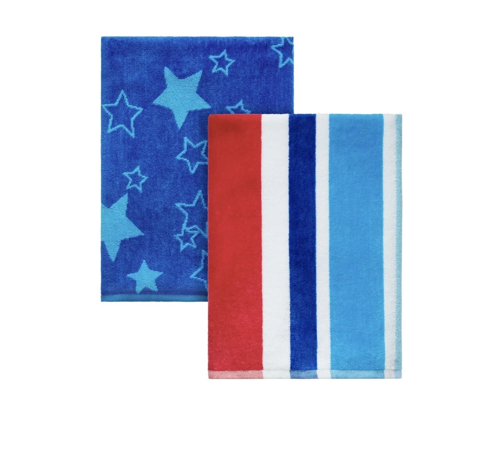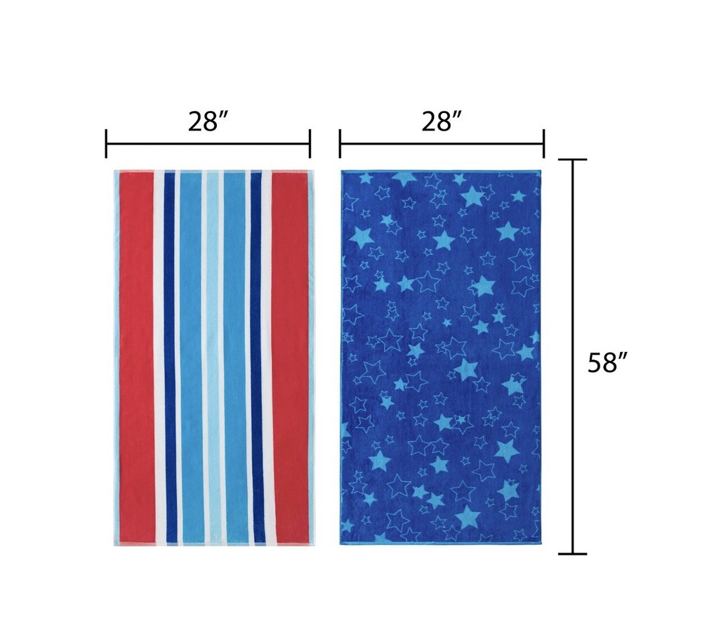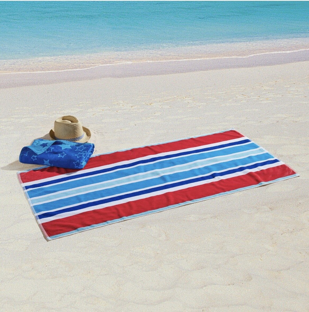 This set of two Mainstays beach towels is perfect for your next trip to the beach. The towels are made of a cotton blend material and feature a striped and starred pattern in red, white, and blue. Measuring 28 x 58 inches, they are large enough to wrap around your body after a dip in the ocean. The towels are machine washable, making them easy to care for. They come in a set with a beach towel and are perfect for adults. The theme of the towels is beach, and they are made in India. Add these towels to your collection and make your beach trips more enjoyable.