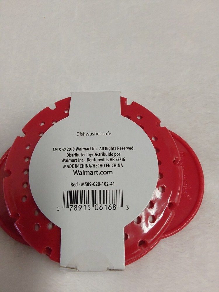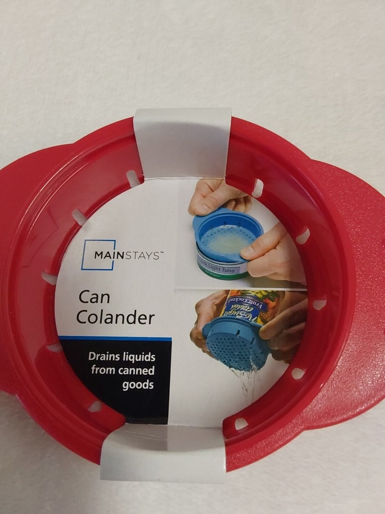 Introducing the Mainstays Can Colander/Strainer in vibrant red, perfect for draining liquid from canned goods. This colander is brand new with tags and ready to be added to your kitchen collection. Its compact size makes it easy to store in any kitchen space and its durable material ensures long-lasting use. The colander is designed with a fine strainer that effectively captures debris and liquid, making it ideal for use with both solid and liquid ingredients. The ergonomic handle provides a comfortable grip, and the colander is dishwasher safe for easy cleaning. Get your hands on this handy kitchen tool today! Dishwasher safe! Measures approximately 4.5" wide with handles, 3.5" wide without handles and 1" deep. Can also be used in some kitchen sinks to keep food from going down the drain. Feel free to ask questions. Thanks for looking! Please check out my other listings and follow me for new items listed daily.
