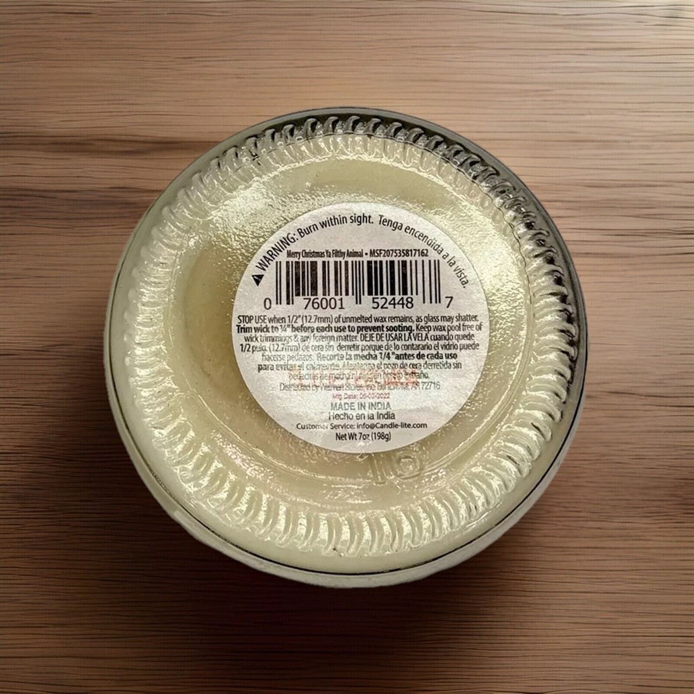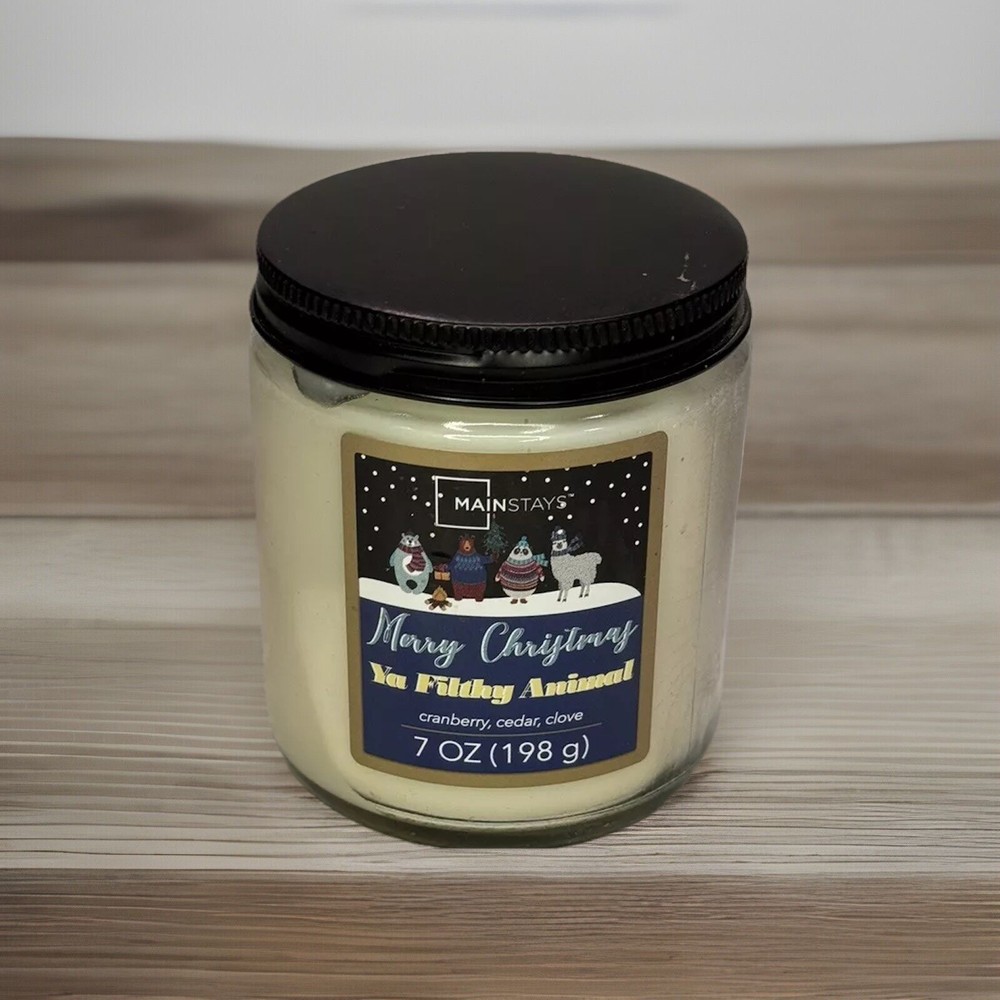 Light up your holiday season with the Mainstays Candle in cranberry, cedar, clove. This 7oz jar/container candle features a warm, inviting scent. The beige jar adds a touch of elegance to any room, and the festive “Ya filthy animal" print makes it an excellent addition to your Christmas decor. Perfect for creating a cozy atmosphere during the holidays, this scented candle is an ideal gift for your loved ones. It's a great way to add warmth and comfort to any space without mentioning its condition. Bring home the Mainstays Candle and enjoy the delightful aroma of cranberry, cedar, clove.