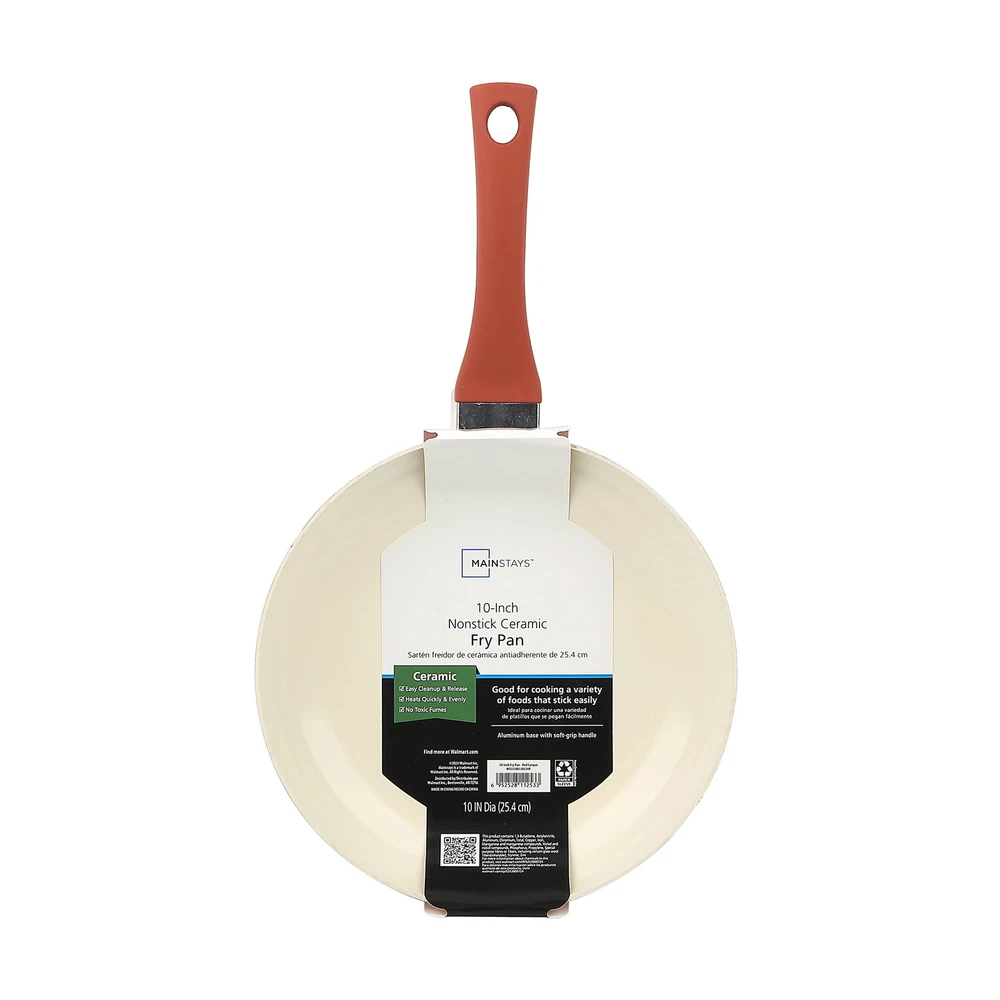 Update your kitchen essentials with the Mainstays Ceramic 10In Aluminum Nonstick Frypan Red Canyon.This 10in aluminum frypan is ideal for everyday cooking at home. Easy clean up. Aluminum body distributes heat more fast and even, it will help you save time cooking as well. The interior is coated with 2 layers of PPG Customized ceramic coating, which is healthy and makes cooking and clean-up easy. Handle is strongly connected by rivets. It is suitable for all cooktops except induction. The outside red color of this frypan will offer a bright pop of color to your kitchen Aluminum body for fast and even heating Riveted handle for strong connection Suitable for all cooktops except induction Mainstays Ceramic 10In Aluminum Nonstick Frypan Red Canyon
