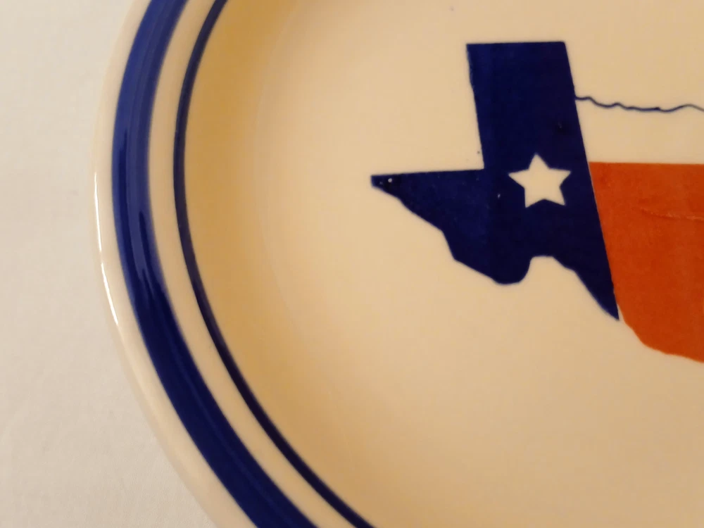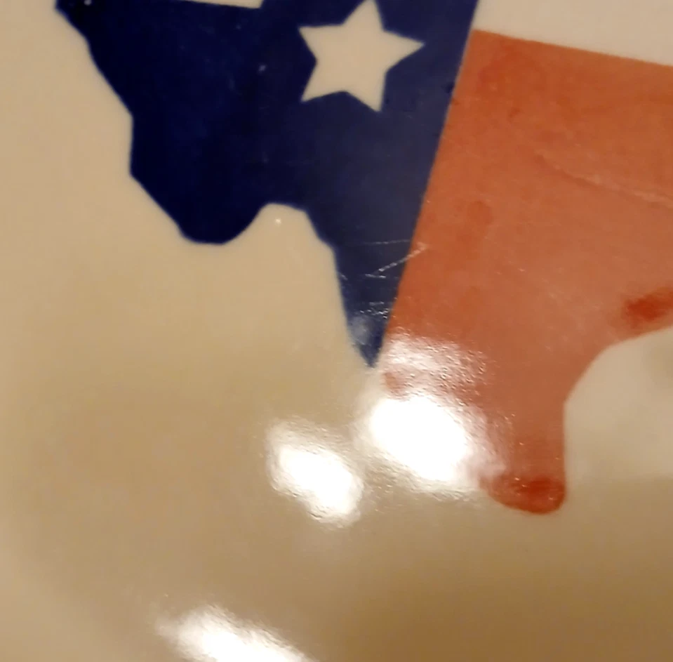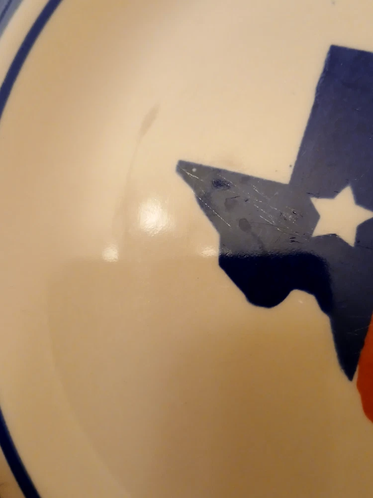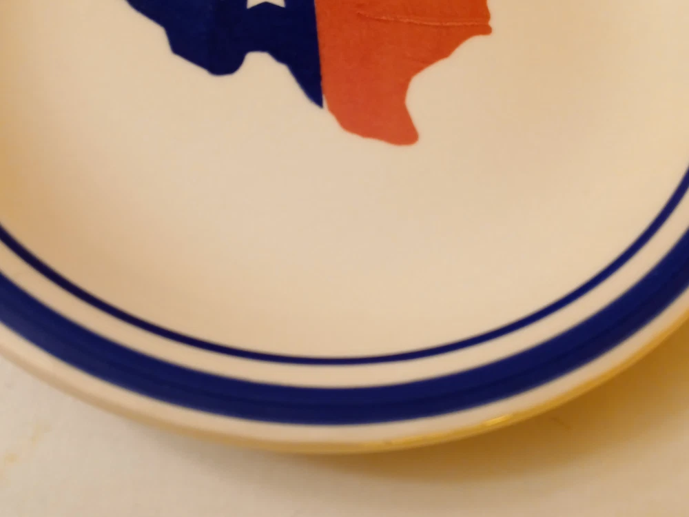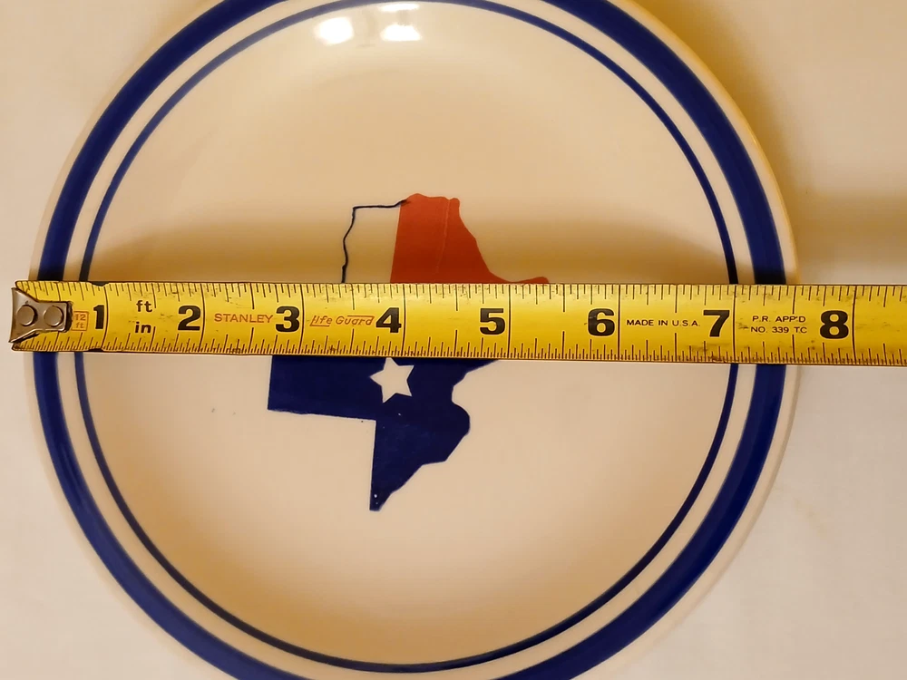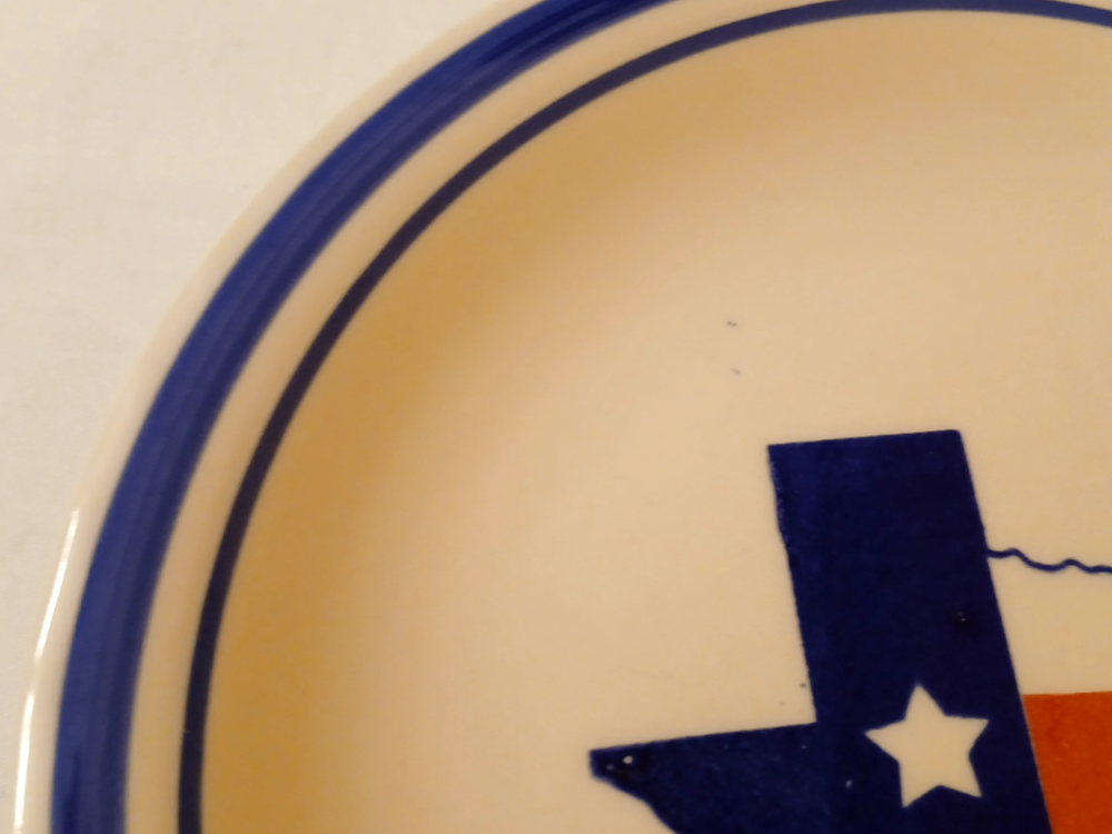 Mainstays ceramic state of Texas salad plate set of 3 7 1/2"diameter 3/4"tall. Utensil marks and spots on inside. Stains on outside. 1 has chip on outside bottom. Refer to pictures for condition. Made in China. Will consider all offers. Combine Shipping - will automatically be adjusted when items are placed in shopping cart.