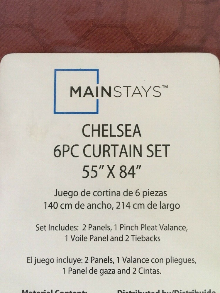 WE DO NOT SHIP TO P.O. BOXES. PLEASE PROVIDE A PHYSICAL MAILING ADDRESS. NEW. NEVER USED. Mainstays Chelsea 6 piece curtain will make decorating your home simply effortless. A complete window dressing hung all on one rod and everyone will think you hired a decorator. The curtain set has a geometric shaped jacquard fabric for the panels, valance and tiebacks with a coordinating voile under-panel. Set includes one valance, two panels, one voile under-panel and two matching tiebacks. The valance and panels are attached. It features a 2-inch rod pocket with pinch-pleat design that could also be hung with clip rings or with drapery hooks (not included.) Mainstays Chelsea 6 Pc Window Curtain Set: Easy to Hang Uses Only 1 Rod 2" Rod Pocket Clip Rings or Pin Hooks Versatile Design